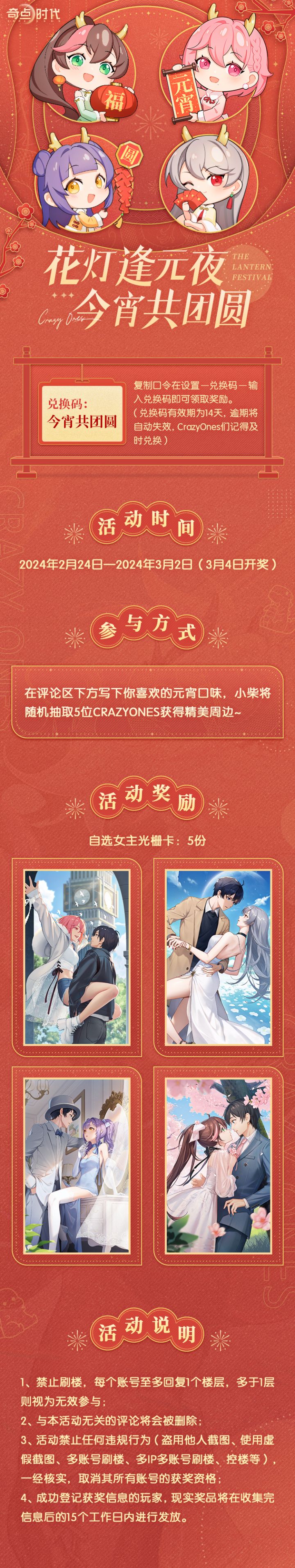 花灯逢元夜,今宵共团圆兑换码:今宵共团圆复制口令在设置——兑换码——输入兑换码即可领取奖励(兑换码有效期为14天,逾期将自动失效,crazyones们记得及时兑换)活动时间:2024年2月24日——2024年3月2日(3月4日开奖)参与方式:在评论区下方写下你喜欢的元宵口味,小柴将随机抽取5位crazyones获得精美周边~活动奖励:自选女主光栅卡:5份#奇点时代#游戏福利#元宵节#美少女