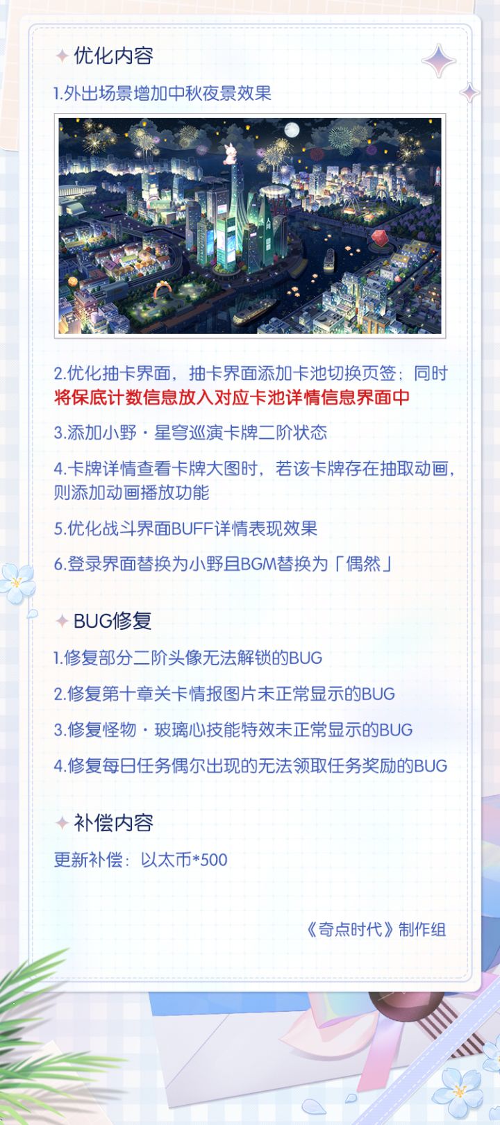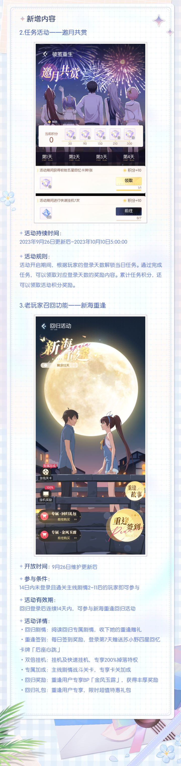 Hello CrazyOnes我们计划将于2023年9月6日6:00~10:00进行停服更新,届时将造成强制掉线,无法登录等问题,维护结束时间有可能随实际情况延长或提前,给您带来的不便深感抱歉。=新增内容=1.七夕·纯爱大作战「白鸥线」更新!·活动持续时间:2023年8月22日10:00-2023年9月25日23:59:59·活动时间调整通知:为了让各位CrazyOnes有更多的时间体验