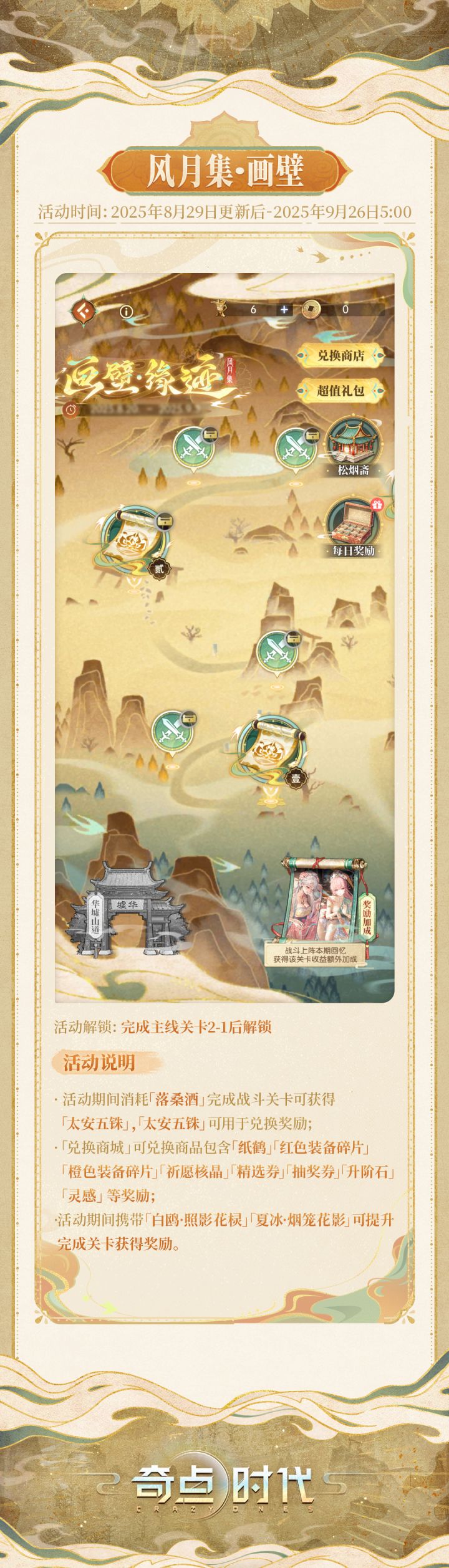 >>>活动时间2025年8月29日更新后 - 2025年9月26日05:00>>>开启条件完成主线关卡2-1后解锁>>>活动说明·活动期间消耗「落桑酒」完成战斗关卡可获得「太安五铢」,「太安五铢」可用于兑换奖励;·「兑换商城」可兑换商品包含「纸鹤」「红色装备碎片」「橙色装备碎片」「祈愿核晶」「精选券」「抽奖券」「升阶石」「灵感」等奖励;·活动期间携带「白鸥·照影花棂」「夏冰·烟笼花影