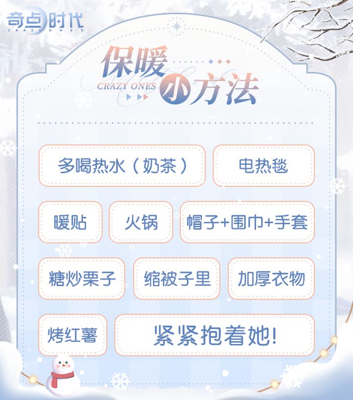 12月首场寒潮即将来袭!过山车式气温俯冲下跌开始了~无论是和她逛街、吃饭、约会...都要做好保暖措施哦~在评论区分享你亲测有效的保暖小贴士,帮助你心爱的她应对低温寒潮吧~也可以戳戳下方图片,看看你尝试过的保暖方法可以连成几条线吧~小贴士:小柴将在评论区随机掉落兑换码来应对寒潮哦!#奇点时代#游戏讨论#游戏福利