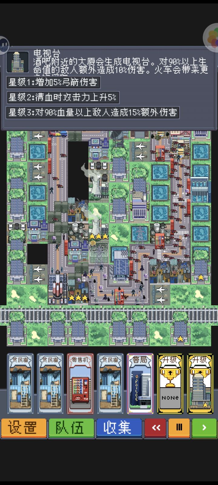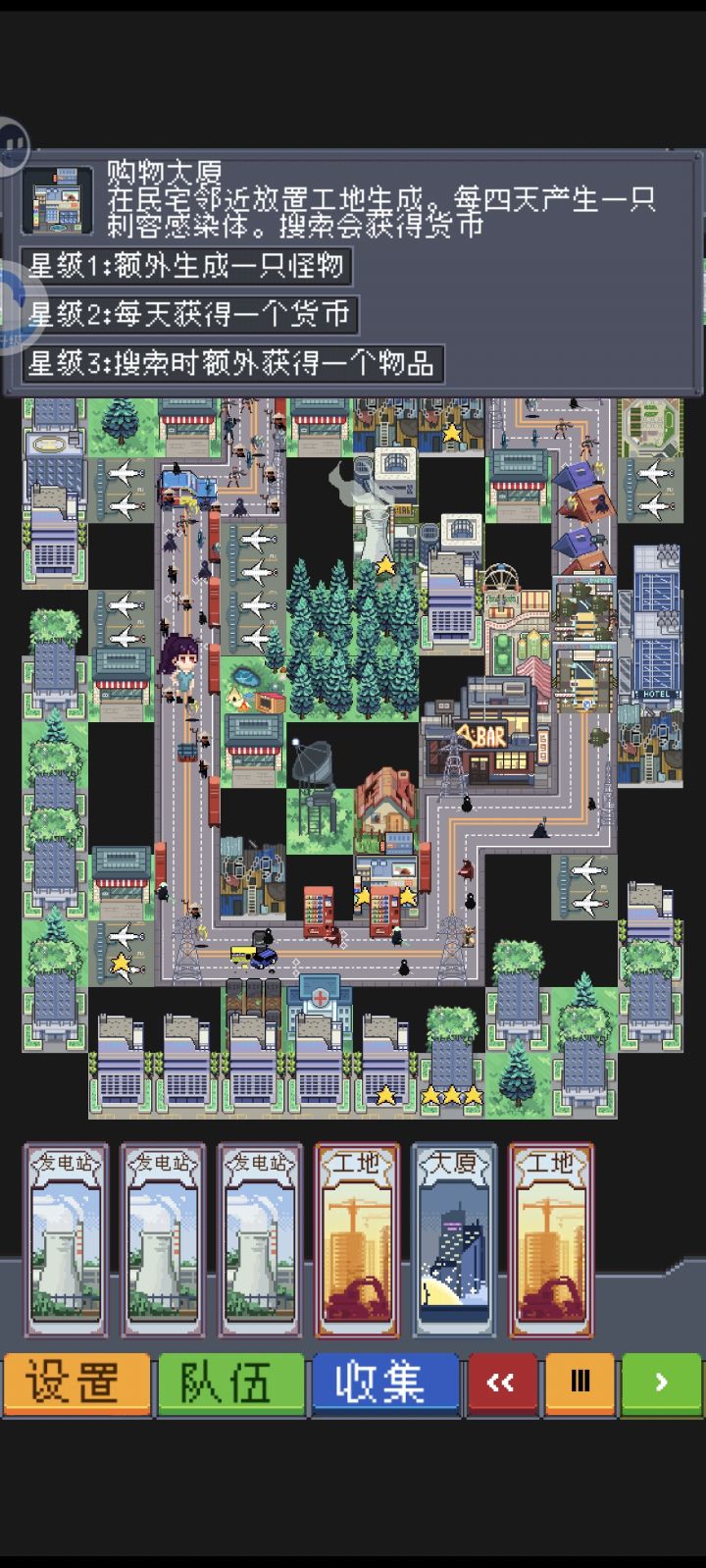 建筑:一、民房:可搜5次,一次一资源。在相邻的空闲道路上放灯减刷怪速度本身意义不大,主要看升级。5次搜查后变成破旧的民房,失去价值。所以升级要抓紧时间。升级路线:a. 学校(+草地)【 】【 ✓ 】【 】【 ✓ 】【民宅】【 ✓ 】【 】【 ✓ 】【 】其中一格有草坪就行学校的作用在刚建起来时就发挥大半了。建起学校时给一本书,并把草地升级成足球场。刷出的机器人可以爆电棍,可