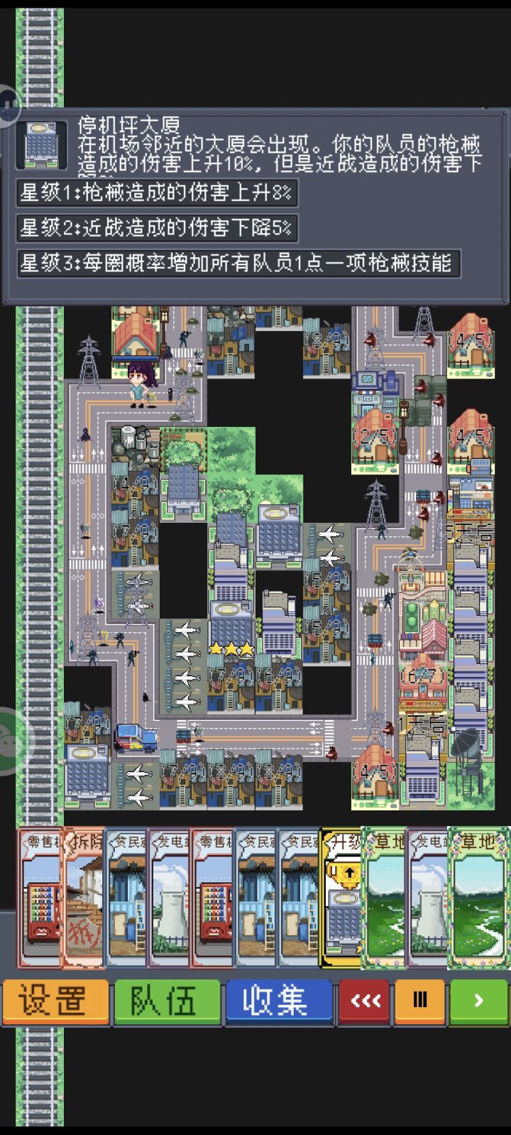 一、大厦:增加技能5%提升概率每放5个在地图随机位置刷一个机场和民房一样,本身意义不大,主要看升级。升级路线:a. 停机坪大厦(+机场)其中一格有机场就行提升枪械伤害,降低近战伤害。和大型公寓相对,都是削弱一种类型伤害为代价增强另一种类型伤害。适合特化伤害类型队伍使用。混合搭配队伍则要在队伍面板中观察伤害贡献来挑选,以最大化收益。但实际上前中期玩家都不需要太在意这些数据。因为百分