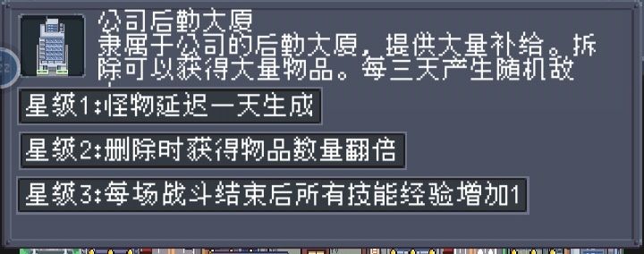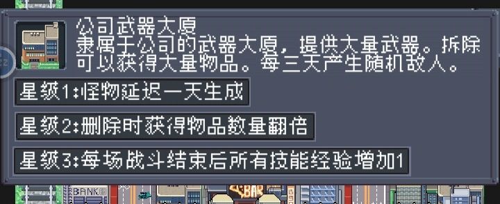 这里用2星银行和警察局增加怪物数量,企图增加 子弹拐弯 时以流弹打死大眼的概率——以及减少只有大眼的概率。 选图时也不一定非要找能放公司,反正零售机摆满前,是不放银行前置以外的发电站的。铺图时把变银行的大厦先铺了,然后靠回收站就能升好多间2星银行了。