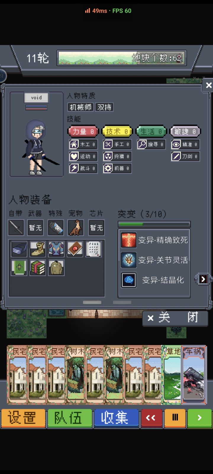 关于如何开启第二章1.平原村的地图填满,会遇见一个武士,击败他可以获得电塔卡牌。2.带着电塔卡牌进入平原村并且放置(必须通过点击卡牌,再选择地图放置,拖动的操作暂时不会触发这个剧情,会在0.2.4修复)3.需要有车祸卡牌,如果有车祸可以跳过步骤3和步骤4。如果没有车祸卡,在营地点击void获取。4.进入平原村放置车祸卡,等待技术达到之后经过车祸卡触发剧情解锁汽车。5.返回营地点击汽车,即可在选择地图位置的地方切换到城市