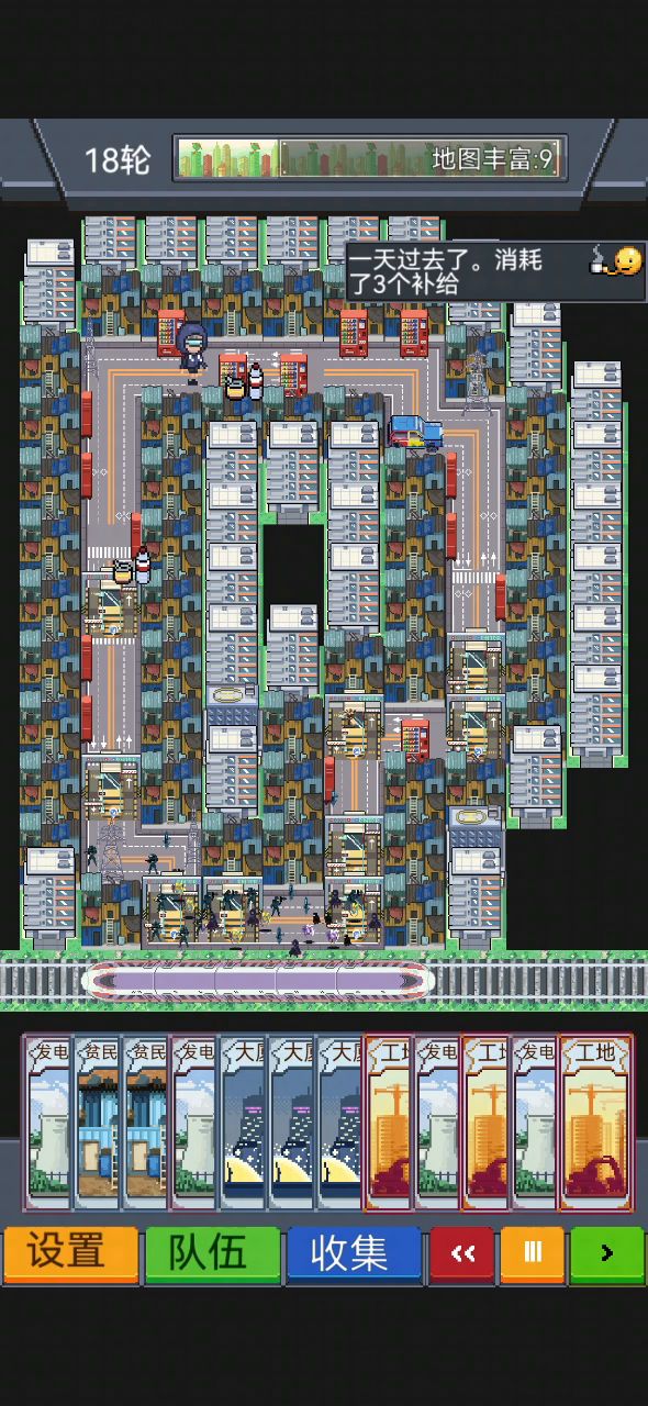 忘记截地图了,就是车祸加垃圾场。垃圾场人物的路线覆盖了,在路线中午我增加了一个医院,四五块鱼塘增加补给。不过打到32轮,我车祸连一半都没,不知道哪些打了二十多轮的怎么把车祸铺满的。