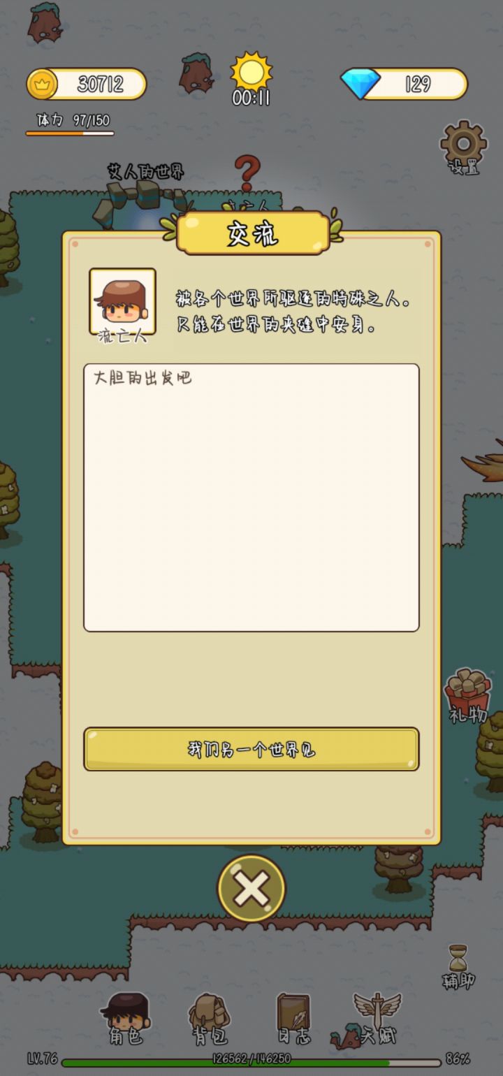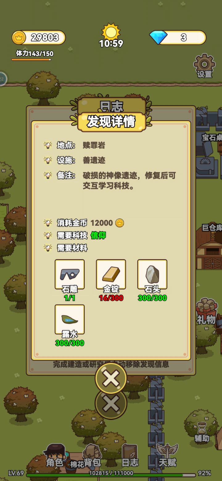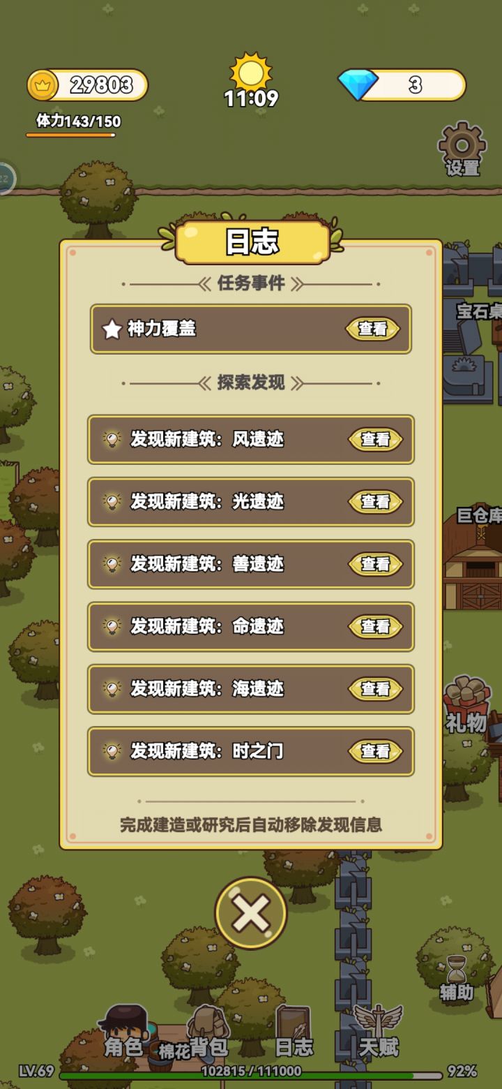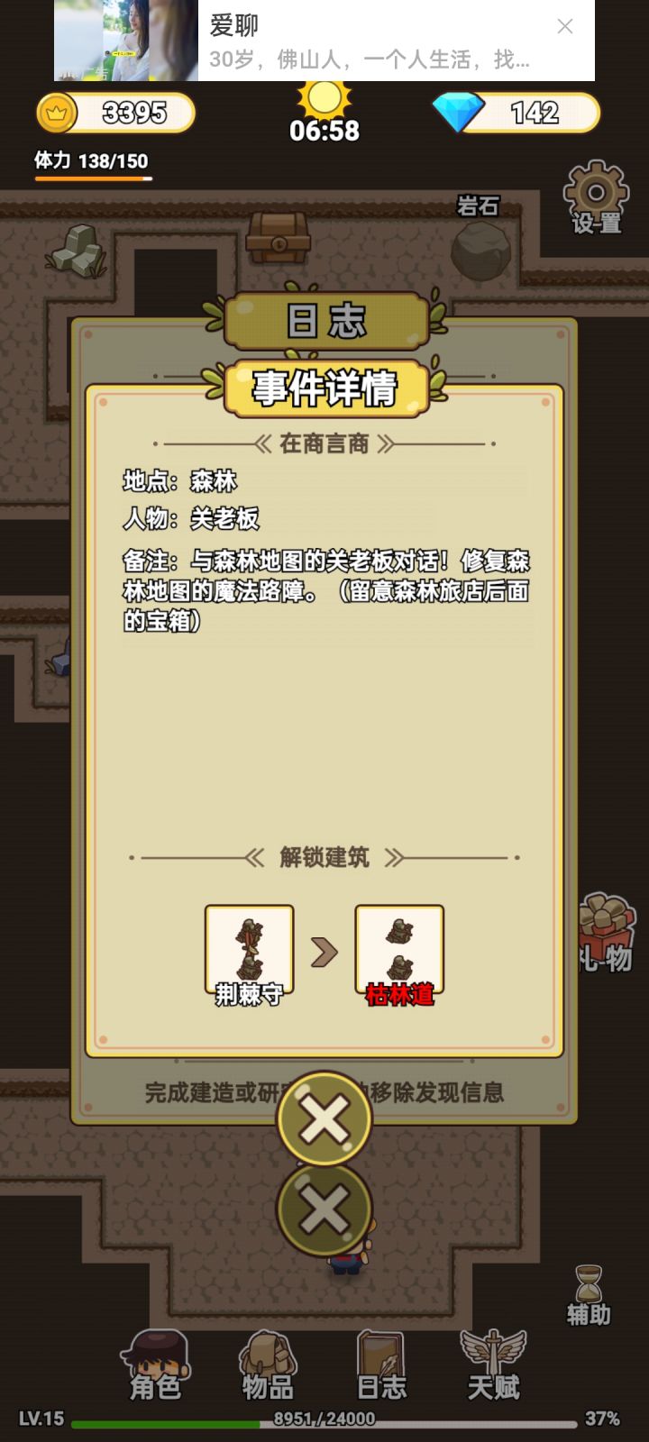 应该算通关了吧,断断续续玩了很久,中间还间隔了好几天没玩,终于通关了,很有成就感。说一说自己的感受吧,地图不是很详细,有时候找不到任务地点在哪,忘记自己是在哪发现的。如果有自动寻怪打怪就更好了😛一路看了不计其数的广告,游戏需要挣钱,可以理解。