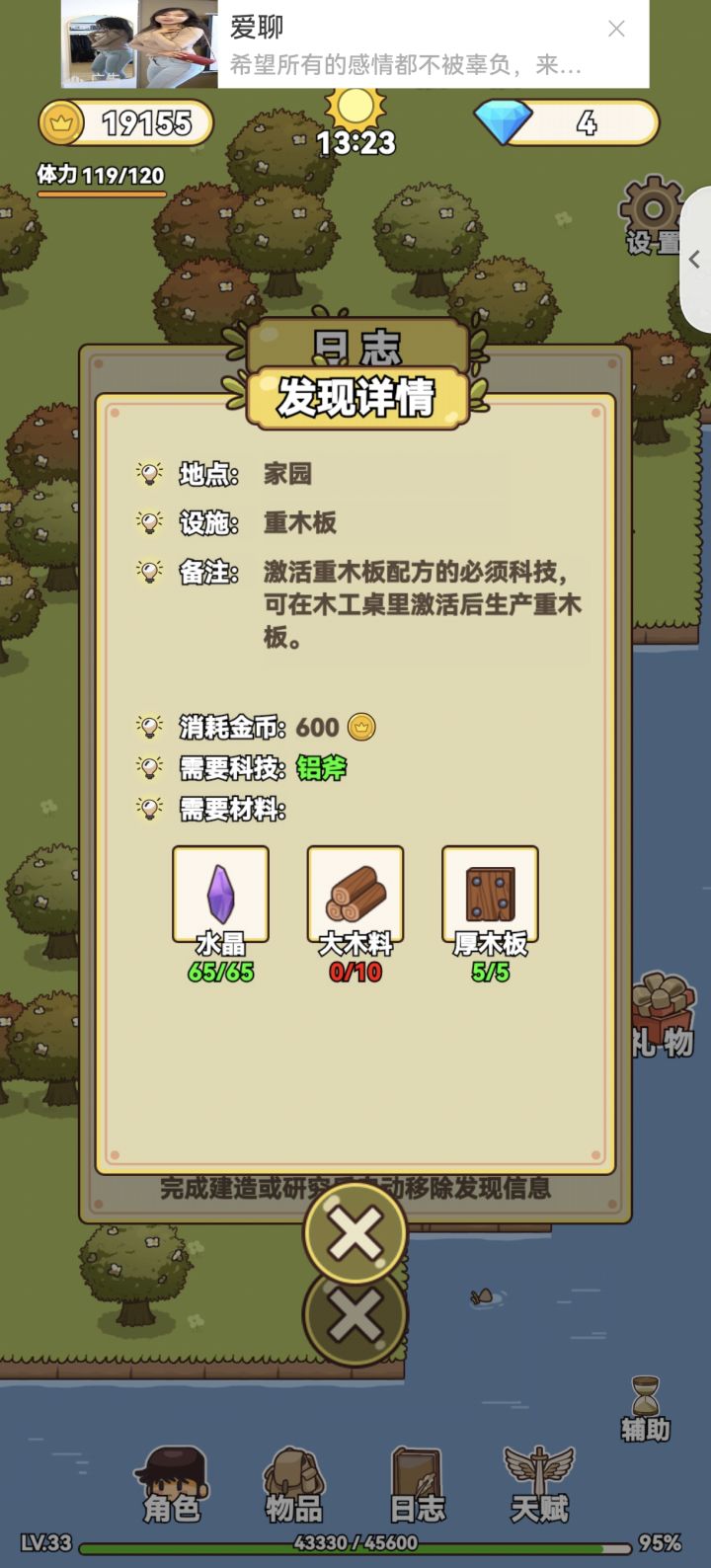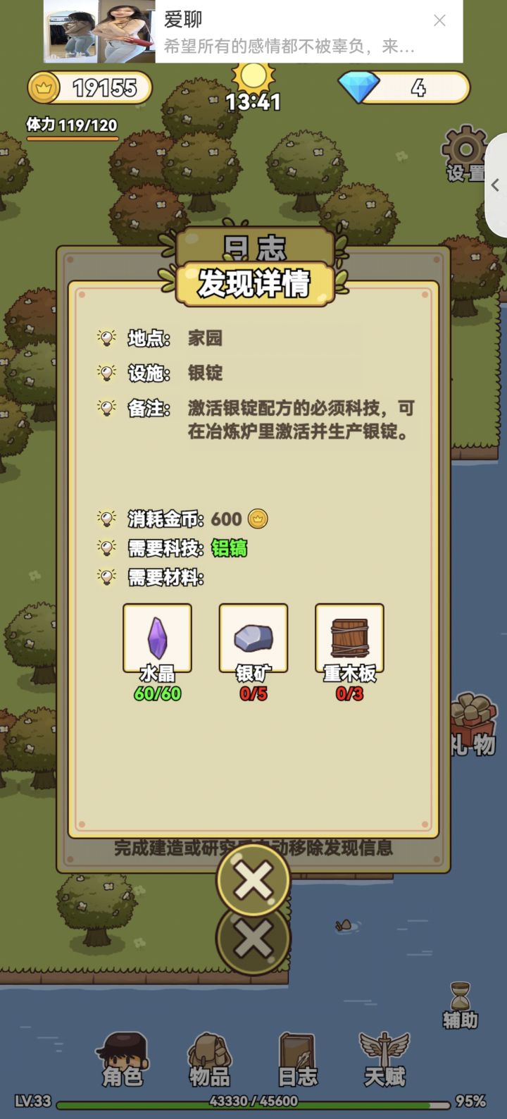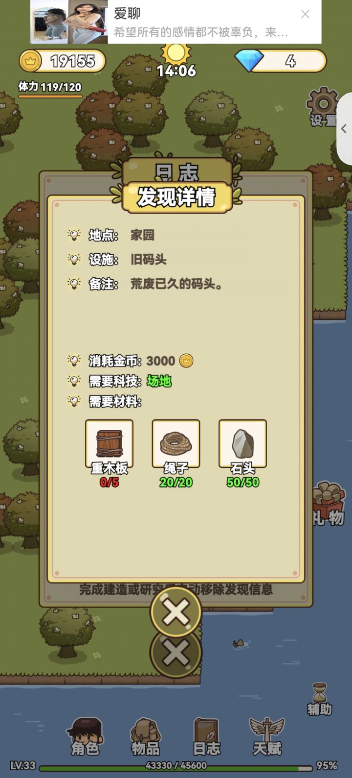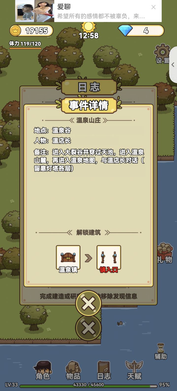 应该算通关了吧,断断续续玩了很久,中间还间隔了好几天没玩,终于通关了,很有成就感。说一说自己的感受吧,地图不是很详细,有时候找不到任务地点在哪,忘记自己是在哪发现的。如果有自动寻怪打怪就更好了😛一路看了不计其数的广告,游戏需要挣钱,可以理解。