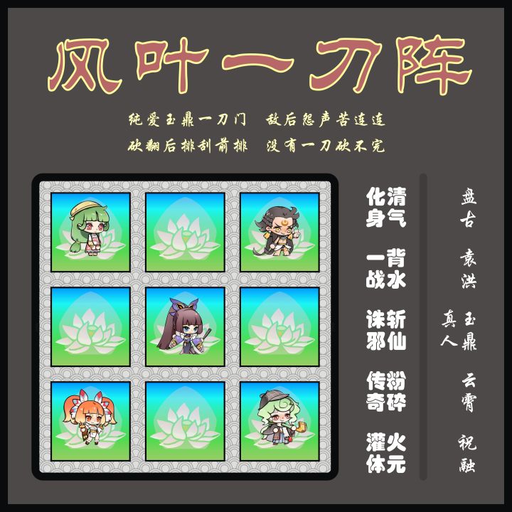 怎么就变成点播?又有小伙伴点“充元阵”,但看了看没找到,索性把三十六阵中所有元气相关的阵在此篇中一起来说吧。《风叶一刀阵》纯爱玉鼎一刀门 敌后怨声苦连连砍翻后排刮前排 没有一刀砍不完将风叶老阿姨好用阵法先摆在开头,是因为这个阵在速放绝技方面确实优秀。只要运气够好,利用袁洪、云霄、祝融的仙人牌,都有可能连着三回合让己方输出连放绝技,属于比较极端的三养一阵容。至于玉鼎,可以利用诸多顶级输出手替