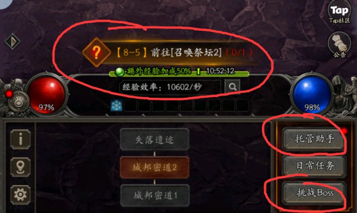 本萌新也是在七月ios上线之后开始玩的这个游戏,对于喜欢暗黑破坏神系列的玩家,大概率会喜欢这款游戏,本质就是打怪爆装备,不过2d游戏中加入了挂机的元素,以及很多长时间养成的元素。今天重新开了个新号玩,就从一级进入游戏开始吧,由于是网游,会有氪金相关内容,但是白嫖的话基本可以获取所有游戏物品,仁者见仁智者见智吧:1.首先进去跟着教程走完,大概能知道游戏所有玩法的入口在哪里,其中有一些没有提到但是