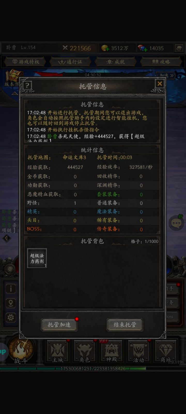 本游戏是个收菜游戏,可以免费离线托管!托管助手可以设置挂机地图刷小怪和跳图自动击杀不同难度的 BOSS。普通地图出装备精华,噩梦地图经验高,地狱地图只有 BOSS。小怪最高出黄装,BOSS 怪出橙装。绿色套装:12 元的七阶段套装可以用到换毕业套装,目前最高 20 阶套装巅峰装备:55 级开放噩梦地图解锁,目前最高 750 套,第一次进噩梦营地会出限时头盔礼包深渊装备:65 级开放地狱地图解