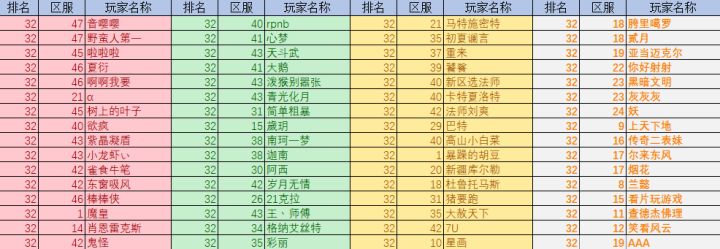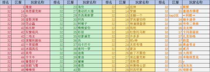 各位亲爱的玩家老爷们大家好呀!又到了卡子快报时间啦~今天的主要内容是上周全民竞技场的排名状况~ 各颜色代表等级区间首先是32强:16强:8强:4强:亚军:冠军:以上玩家可获得奖励:冠军:Xll*1、高级献祭石x5、重塑石x50、钻石x800亚军:XI*2、高级献祭石x3、重塑石x40、钻石x640第3~4名:XI*1高级献祭石x1、重塑石x32、钻石x520第5~8名: