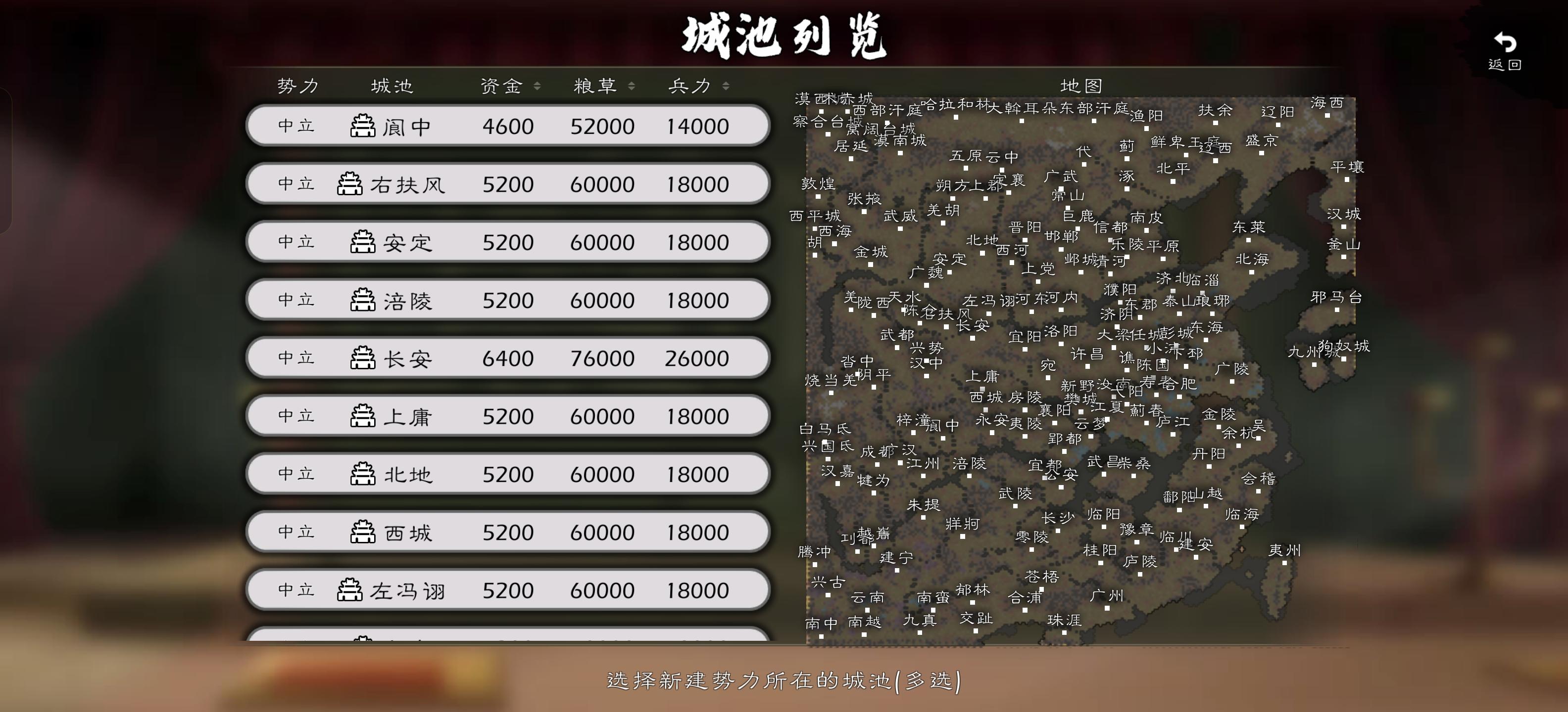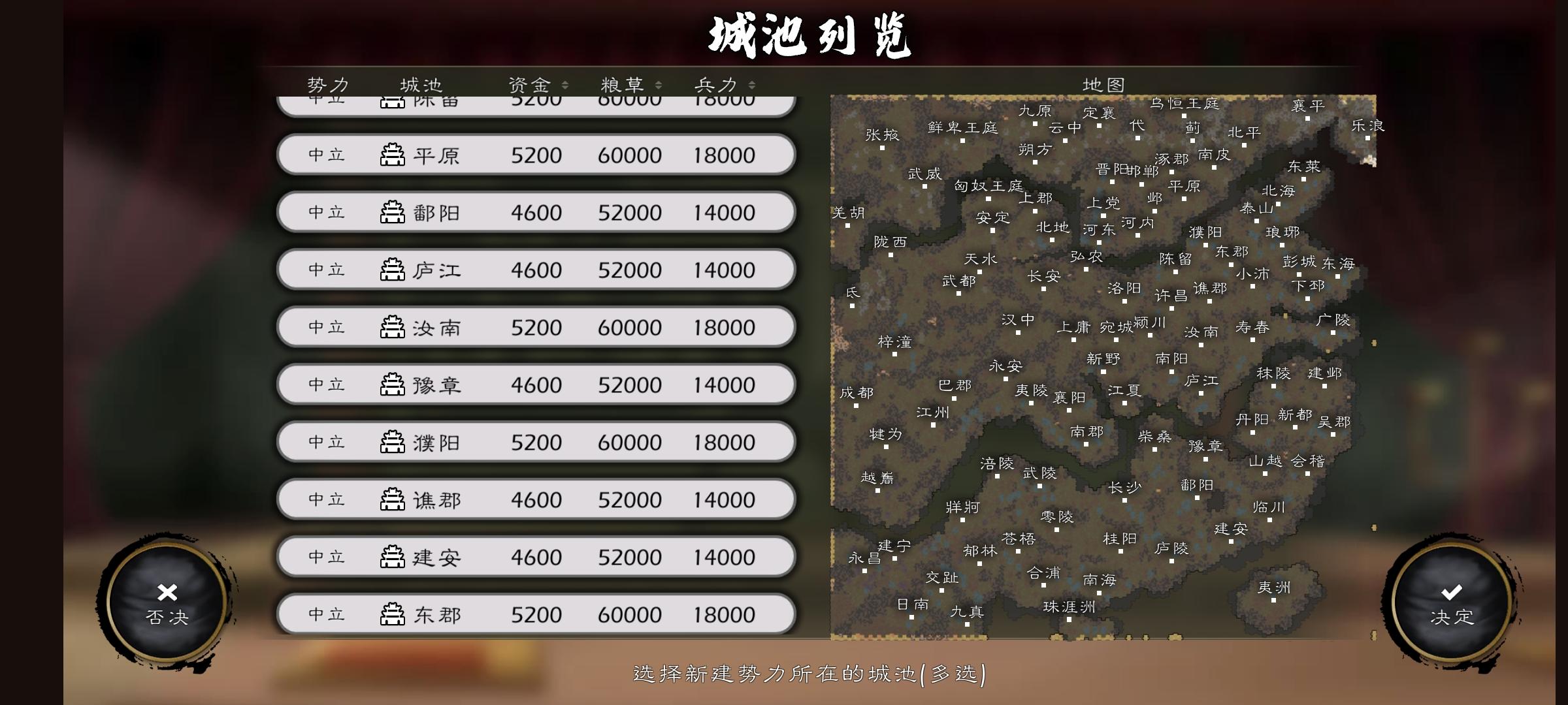 29势力98城80府14关47港增加六个游牧民族和刘协张角势力除去几个大城,小城市都是一城一府比例整齐每个城市都根据地理位置设置了不同的钱粮收入和兵力产生(南方城市粮产多,北方城市兵力多,游牧民族钱粮稀少,兵力产生多),甘糜卞邹樊几个夫人不登场,司马家的人全在刘协麾下。