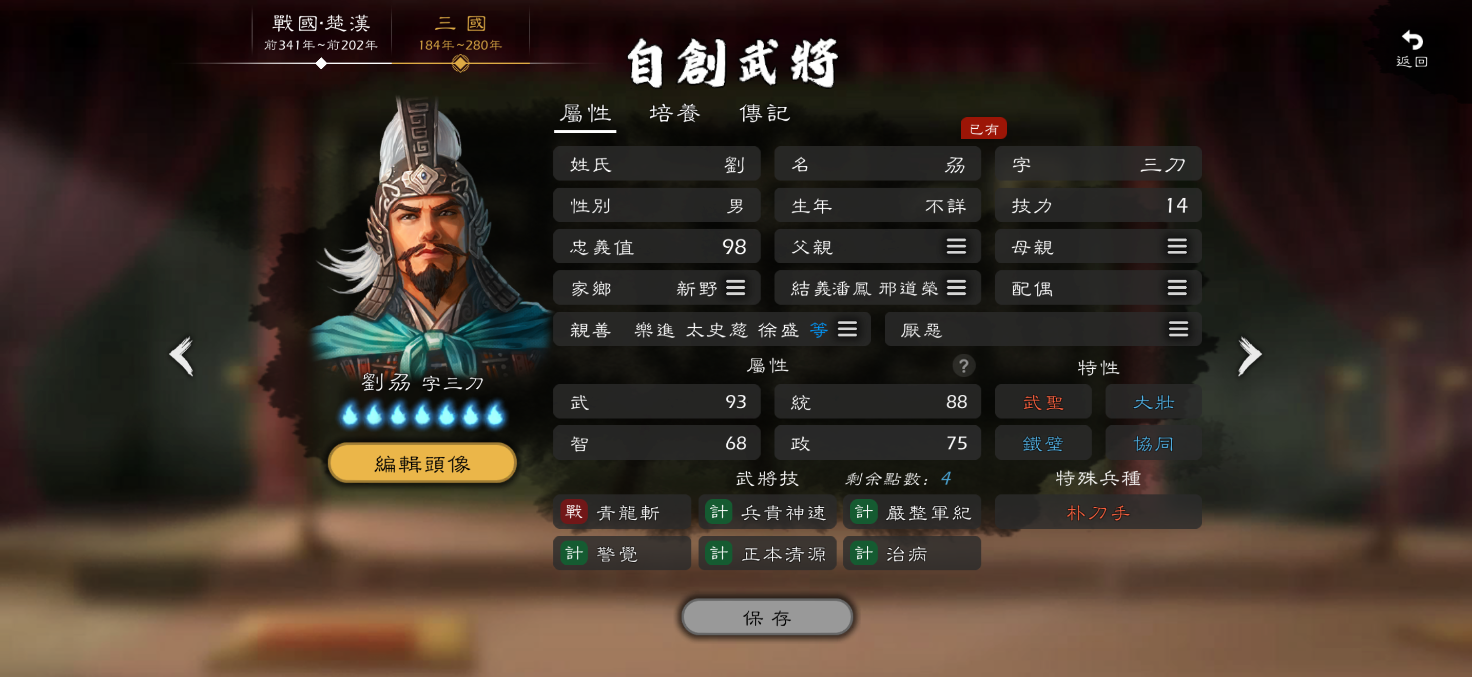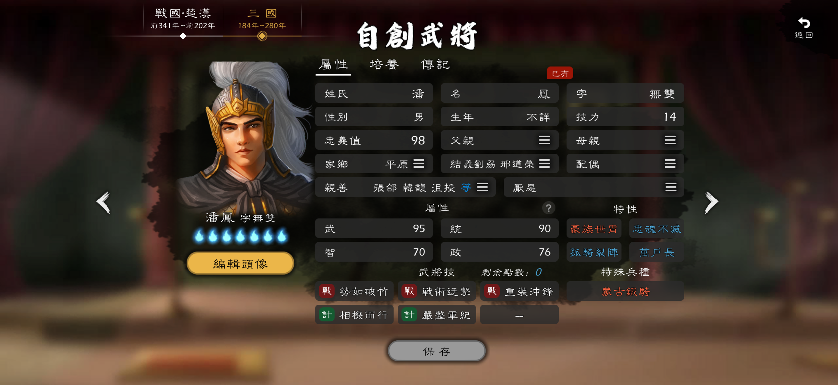 剧本说明:因为战国自建武将里, 许多人都拥有永动武将[我也是其中一个],在开剧本时会忍不住加入自己势力,DLC三国神将也是。在本剧本中,人均都是武统之和大约140的菜鸡,你一个武统双百的神将加入,他们会直呼受不了。名将赵奢之流会被秒杀,超人白起之流也会被打的抬不起头,我觉得这不是剧本该有的游戏体验,体验感直接降至冰点。因此我直接放出的是存档,一个是剧本要一直修改可能失效,也免去了你自己加入神将的