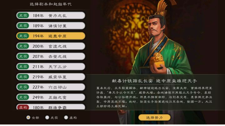 起因是本人以为燕之霸业意思就是选公孙瓒统一天下即可,花了半天耐心打完发现其实是需要选公孙度。我个人认为公孙度在史实189讨董、194逐鹿这两个副本还可以打,但是官渡之战就不太轻松了。对我这种喜欢往后推剧本的人来说,是不太喜欢重新打一遍的,所以我尝试了一种新方法,利用存档来刷霸业成就。 前提条件:需要一个即将霸业的存档,也就是自己得先打一个剧本,感觉快统一的时候就存一下。加载进去之后,我们点击人