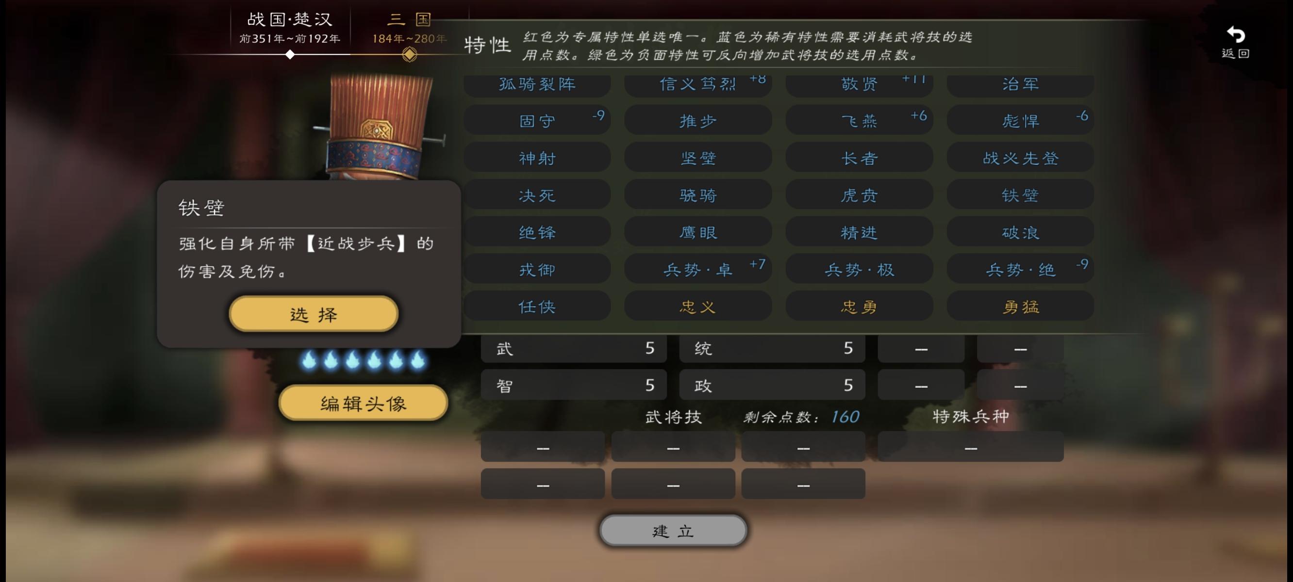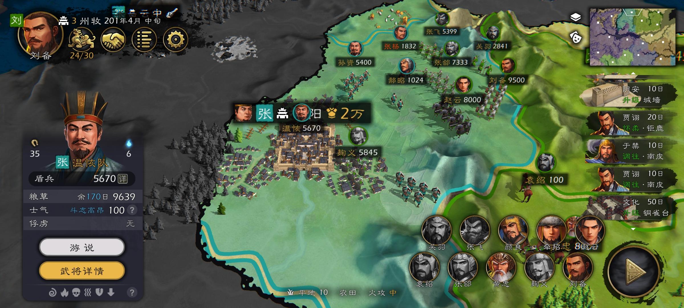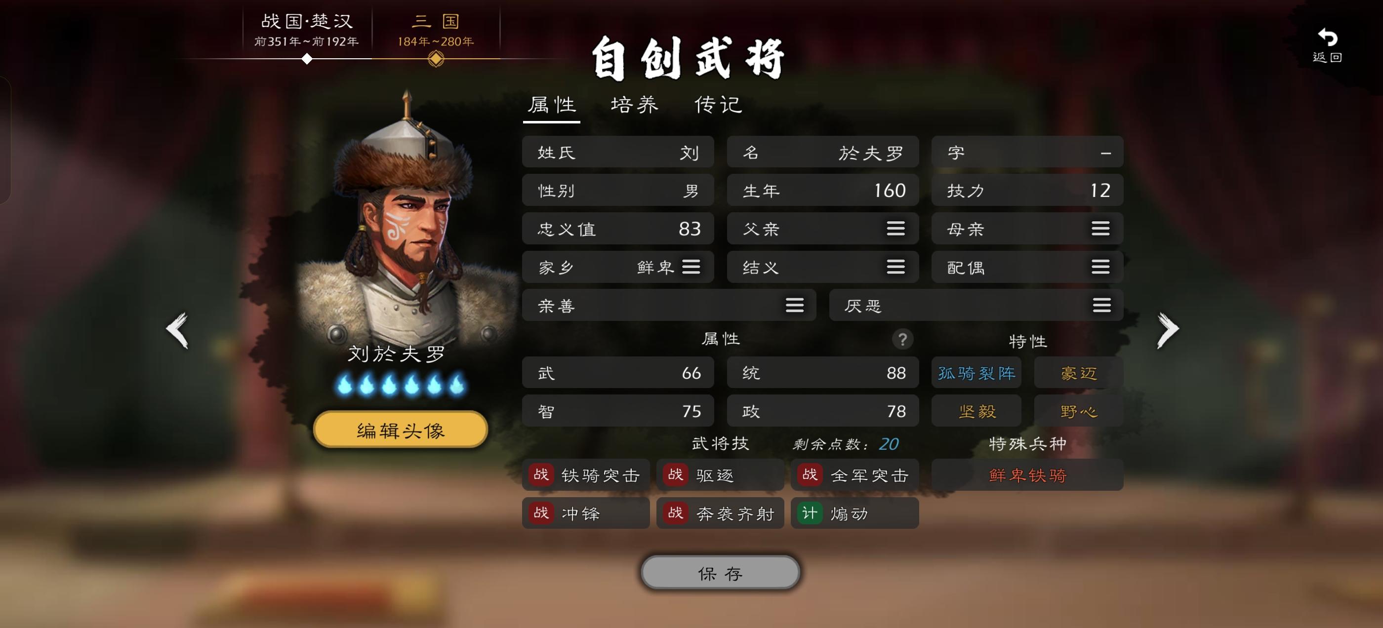 没法调月份,所以开春吕布就占据了衮州。加入了南匈奴右贤王於夫罗,因为自定义人物出生最多到160年,所以左贤王刘豹还没成年,蔡文姬已经被抓架空人物南匈奴军师各势力人员综合分配自建地图不能正确识别地名,所以会出现在野人物乱跑,以及开局存在可登拥人物,还有曹操虽然占据许昌但是可能没法迁都。另外军师没法设定,所以所有势力开局都没设置军师,另外友好度也没法设定,所以三让徐州的事件可能