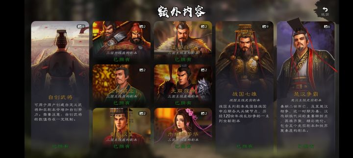 我就三个问题第一个地图晋阳,西北那一块,始终不改,地图太小就加大,北方整个匈奴,中间太空,就加城,小城太多,变小为大第二个红色特性,楚汉时期的陈平,龙且,陈胜(陈涉世家指的就是陈胜)三国陆逊,陆抗父子,为啥不是红色特性,开国,护国不算大功?还有人物为啥不加,张宁,陆康,王元姬,蔡贞姬…等为啥没有第三个,战国楚汉,为啥没玉漱,为啥不开放扶苏跟大秦公主的头像,为啥?给个合理的解释
