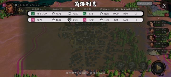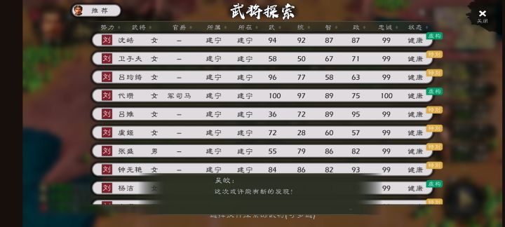 给老帝提几个建议 每个武将加一个显示族谱的功能,要不然玩的时间长了,同姓的武将都不知道谁是谁家的,三代以后就靠人物信息面板里父亲栏是很不方便的。 调遣武将的时候也加入一个搜索武将的功能,不然后期武将多就很难找。 在浏览全部势力的界面加入可以根据兵力,粮草,资金等排序的功能,方便查看势力情况。 在子嗣列表里加一个改名功能。 降低ai进爵所需的城市数,或者直接改逻辑,比如称帝需要30座府而不