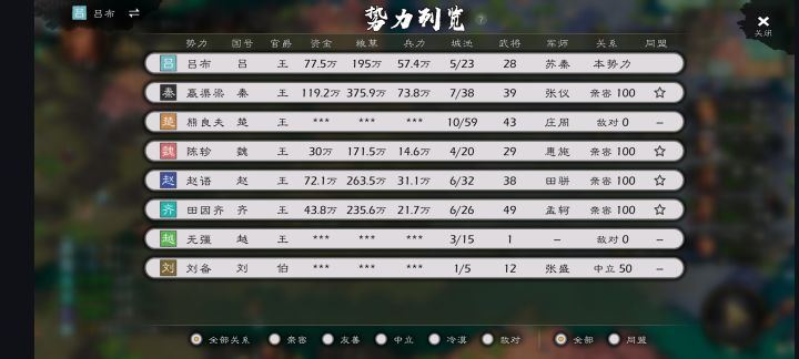 数据变化可以是每一旬,或者每个月相比上次钱粮兵武将数量增减多少,这样不用手动计算。这样也能更好的对局势把控 比如某势力一回合加 5000 兵,我消灭他 6000 就能逐步灭掉,两线作战也能更好的分配资源