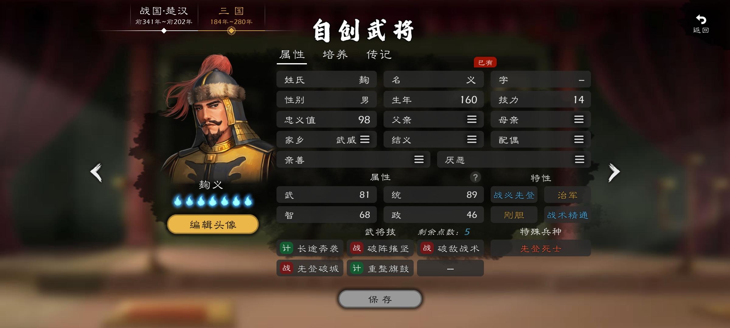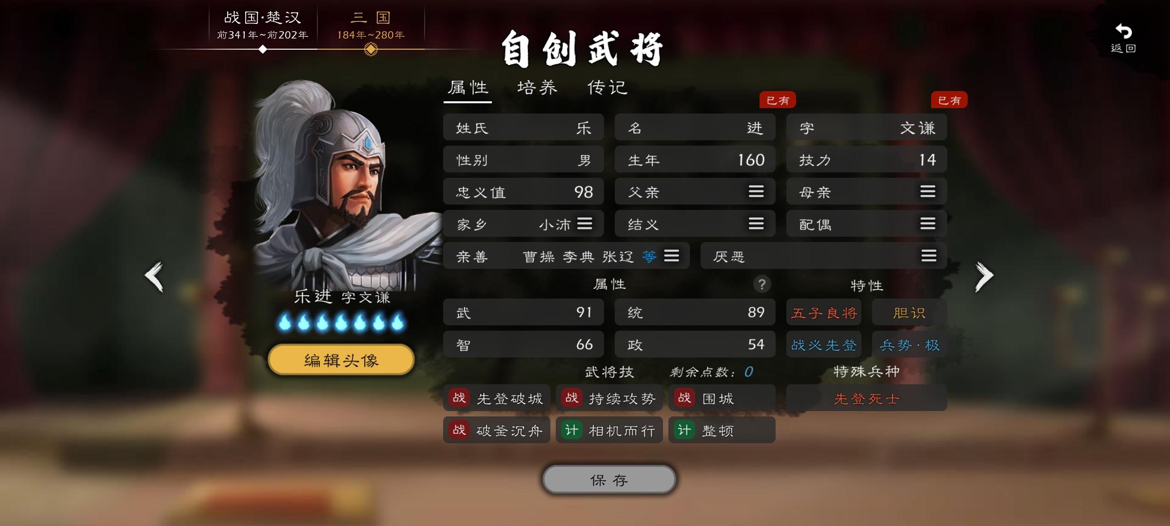 把培养页士气那一片建议换成持盾,把长枪2去掉,长枪3从武勇3那延伸,然后把士气加到统兵2那里,特性忠勇换成治军或者不屈,都有兵势极了难道还不会治军吗,同时建议乐进武力上到91,智力66,毕竟是三国有名的先登狂人,同时也被称为计略周备,技能猛攻换成持续攻势麹义建议加一个治军,毕竟800破万骑,没有治军可还行,培养页持盾效果给到5,智