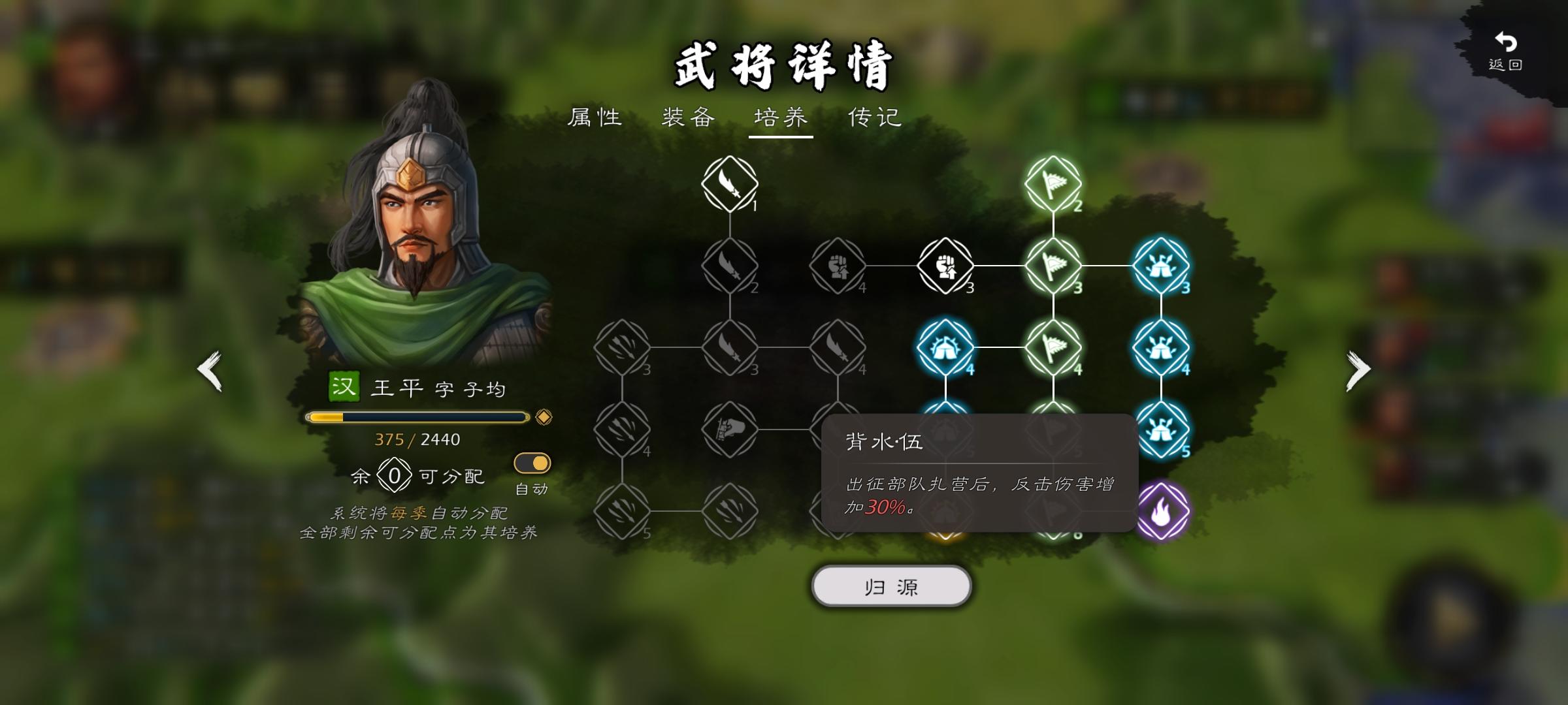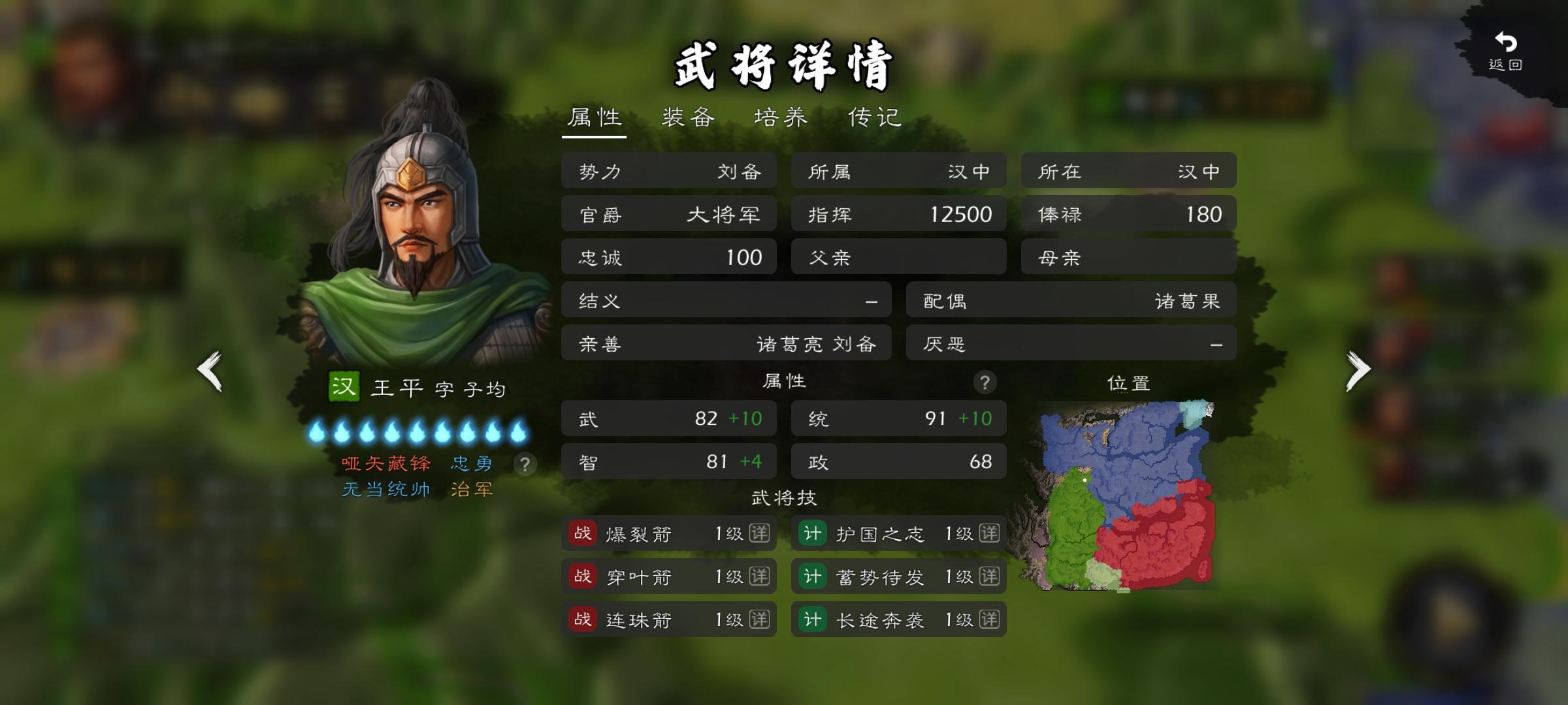 建议给王平培养页扎营加强反击的延伸一个顶配反击增伤,既然都给了个重门战术那再加一个顶配的反击,岂不是更好,直接扎营一夫当关万夫莫开,还有那个士气加成的建议换成太守降伤的那个牢不可破,这样还能当个太守玩玩,本身有治军也不缺士气,顺便再给他个兵势极吧