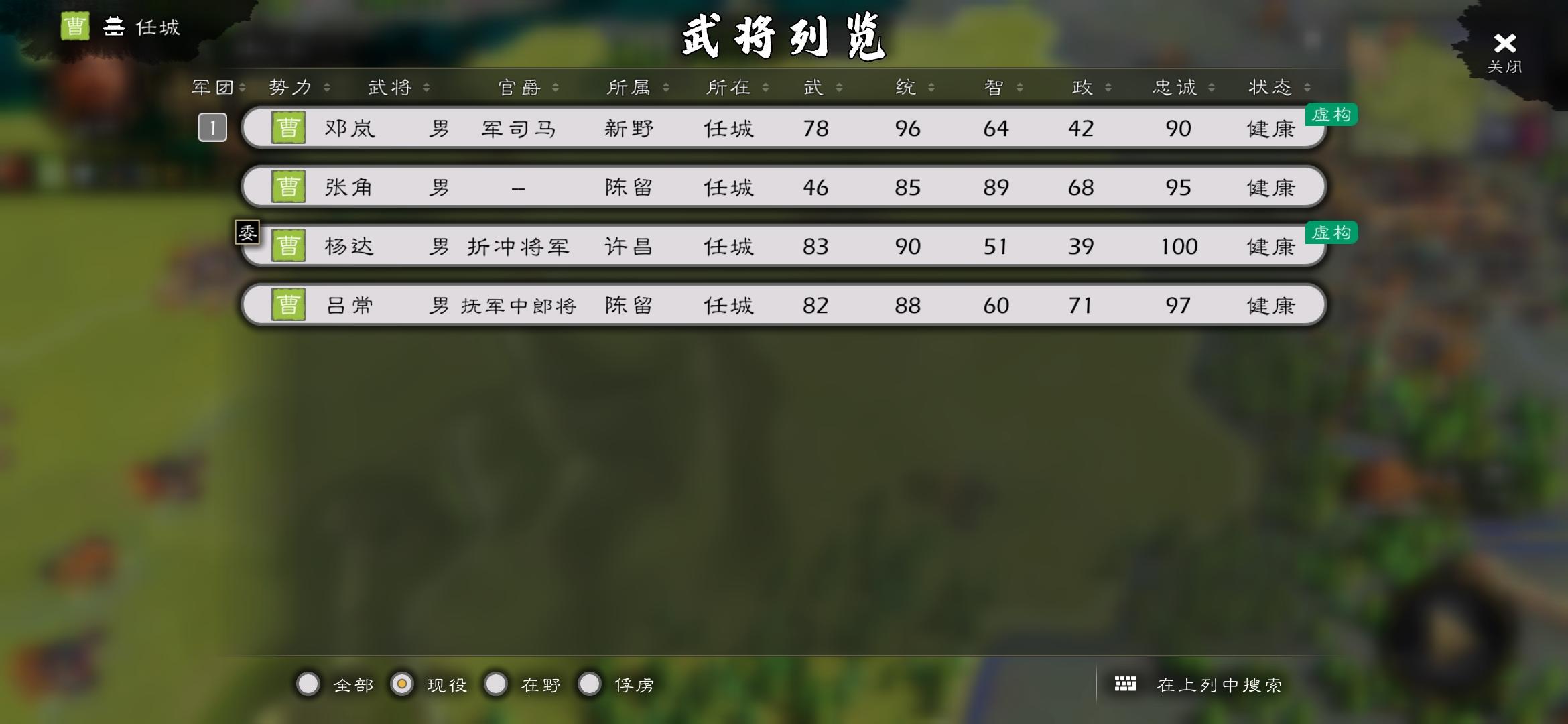 调了邓岚来守任城,显示到了任城,选择时却显示在做探索任务,只好派杨达来守城,从现役页面看邓岚是在任城的,换太守选择时却没有。