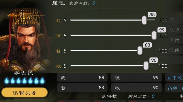 【自建】唐太宗李世民武力:92统率:99智力:98政治:99可是,自建给的属性点完全不够用,所以能不能开放一下自建属性点?