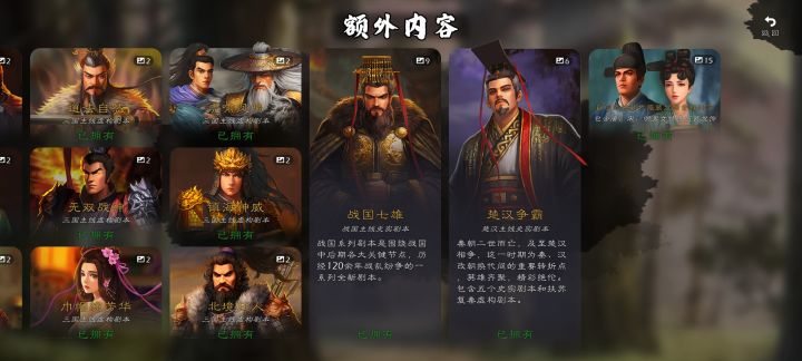 额外内容的剧本是不是该多些玩法,不然每个额外内容基本是灌汤不换药,基本就是换个背景给几个特殊武将。完全可以尝试些不同的玩法,比如穿越剧本玩家自定义武将穿越三国在三国一步一步成长能力一步一步解锁,完成试炼可以成为最强武将。还可以带点神话色彩,加些特殊的机制。