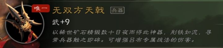 不同于本体装备和自建装备,一些dlc装备有着额外效果。战法或计策增伤,响应本身特性,或者自带兵符效果。吕小布的专属兵器,除了直接增加9点武力,还有全能战法增伤效果,大概增加不到10%。张三的专属兵器除了提供超高伤害增幅,并增加战法【夜叉探海】30%伤害。专属宝物只看纸面甚至不如自建装备,但增加战法【黄泉送葬】30%伤害。黄老爷子的专属宝物看起也是一般般,但只有装备该宝物时特性[烈羽]才有增伤