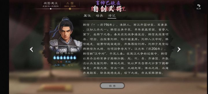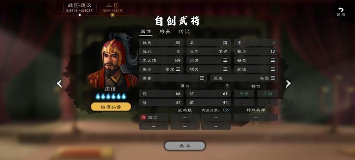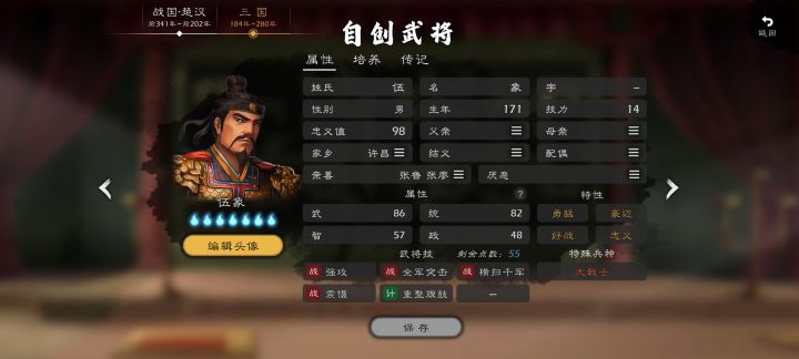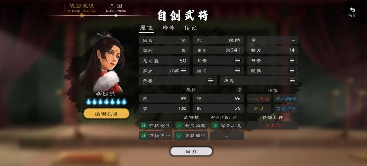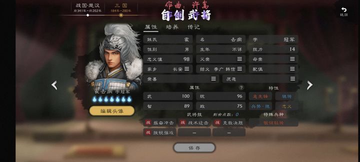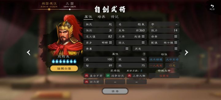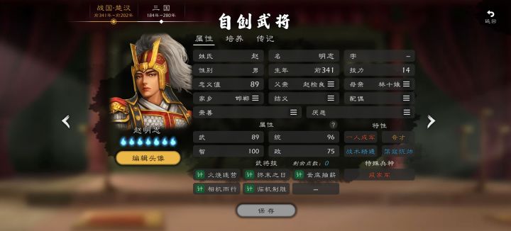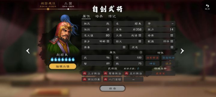 姓名:织田信长属性:武82、统90、智91、政95特性:第六天魔王(红,极高的扩张欲望,无法被成功游说,极大幅增加伏击伤害,极难被招降,)、革新(红,勤政效果加担任君主时额外加快官僚设施建立和升级的速度)、铁炮达人、兵势·极、残忍武将技:三段击(两段伤害,远程步兵可用)、远当、闪电突袭、长途奔袭、重整旗鼓培养:信长之野望(金,全属性加1)、乐市乐座(金,担任君主时势力资金产出增加5%)