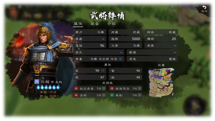 【名将传记】马超,字孟起,扶风茂陵人,汉伏波将军马援的后人,马腾的儿子,少年成名,曹操曾多次征召马超入京为官,但都被马超拒绝。而后马腾入京被封为卫尉,马超就统领了马腾的部队。建安十六年(211年),曹操治兵关中,马超联合关中诸侯韩遂等抵抗曹操,曾一度对曹操造成了极大的威胁,但被曹操用离间计击败退走,而后聚拢部队再次攻取陇上诸郡,失败后依附汉中张鲁。刘备攻打刘璋时,马超投降刘备,与刘备军合围成都