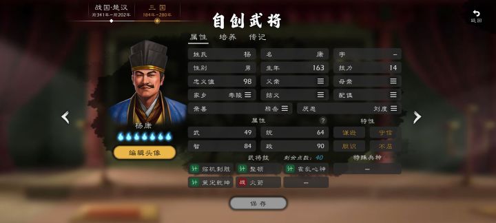 姓名:真田昌幸属性:武73、统87、智92、政78特性:表里比兴(DIY红,每回合有一定几率额外回复技力值,担任军师时可同时执行三项外交计谋,增加战法、计策的伤害)、巧变、治军、机敏、奇才武将技:相机而行、攻心之计、诡诈奇谲、霍乱心神、策定乾坤、乱世之劫真田幸隆之子,武田家臣,被称为日本绝世的谋将。年轻时作为武田信玄的侍从习得了兵法谋略,以智谋为武田家出力。武田灭亡后独立为一方小势力,在北