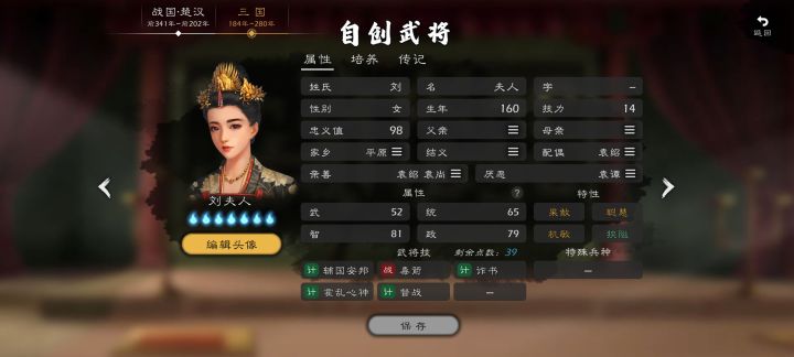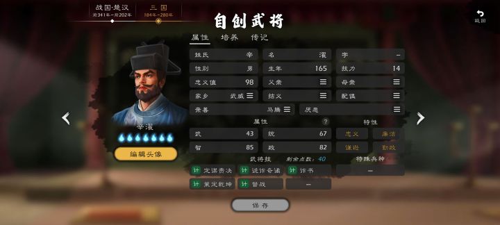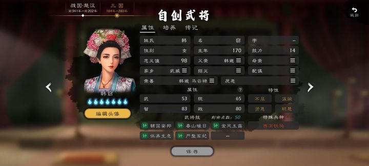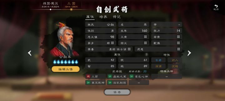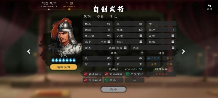 姓名:石田三成属性:武56、统65、智72、政90特性:忠义、勤政武将技:围城、辅国安邦、安营维稳、牵制地侍(村长)出身,受到丰臣秀吉提拔,于后勤治政方面表现出色,被任命为丰臣五奉行,同时也是丰臣政权文治派的代表人物。作为丰臣秀吉的亲信处理了“秀次事件”,加上文治派首脑的身份和侵朝战争中弹劾前线武将烧杀抢掠的行为使得石田三成受到了绝大多数人的厌恶甚至憎恨。丰臣秀吉死后作为丰臣忠臣认定德川