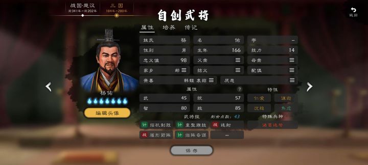 姓名:太田资长属性:武85、统88、智81、政70特性:铁壁、治军、忠厚、深谋武将技:扰乱敌阵、击退、破敌战术、强弓齐射、安营维稳扇谷上杉氏家臣,拜领上杉持朝的名讳改名太田持资,法号道灌,一般称呼为太田道灌。擅长筑城练兵、修筑了日本关东著名的河越、岩槻、江户城。精通步兵、弓兵、骑兵的多兵种配合,以精通战术的军事家身份纵横关东。同时勤勉学问,有汉诗传世。因功高震主,虽有五年不再上阵厮杀,隐