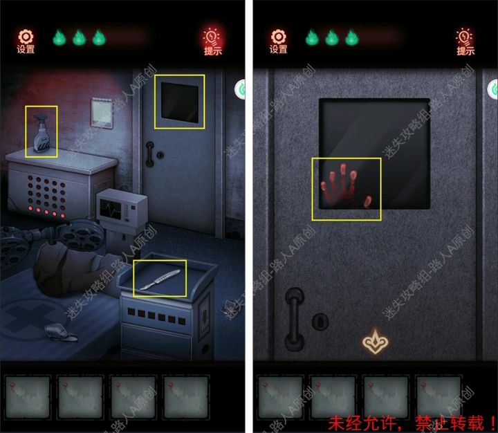 第五章攻略1.拾取【清洁剂】和【手术刀】,然后查看门,得到线索。1.12.根据血手印的提示,打开柜子,拾取【电源线】。2.13.用【手术刀】割开封条,拾取【3克砝码】和【女孩木娃娃】。3.14.用【清洁剂】清除柜子侧面的污渍,得到线索。4.15.将【电源线】插入地上的插座。5.16.根据提示,打开抽屉,获得【钥匙】。6.1、6.27.用【钥匙】开门,离开病房。7.18.打开护士站旁