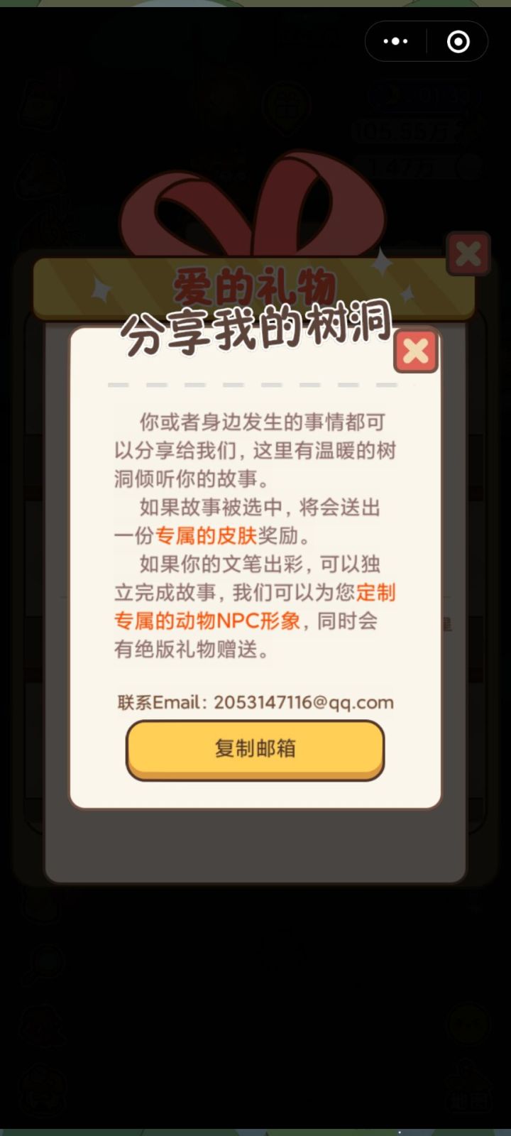 生活中某些开心的、难过的故事,是否没法向身边人开口?来熊猫树洞吧,这里有温暖的熊猫树洞愿意安静聆听你的故事,我们会默默的陪着你一起开心和难过。你或者你身边发生的事情都可以分享给我们。如果故事被选中,将会送出一份专属的皮肤奖励。如果你的文笔出彩,可以完成独立的故事,我们可以为您定制专属的动物NPC形象,同时会有绝版礼物赠送。你可以悄悄发送你的故事到邮箱:2053147116@qq.com你