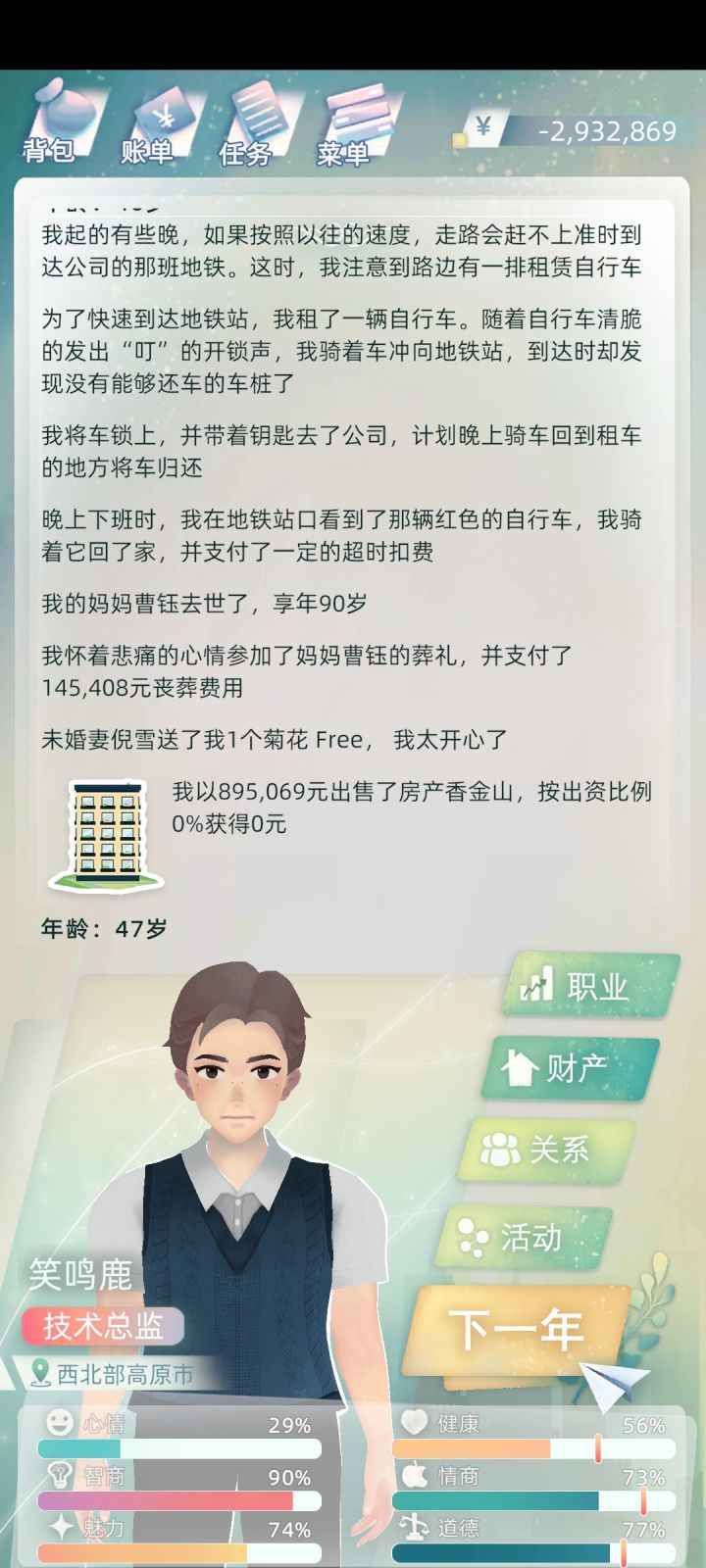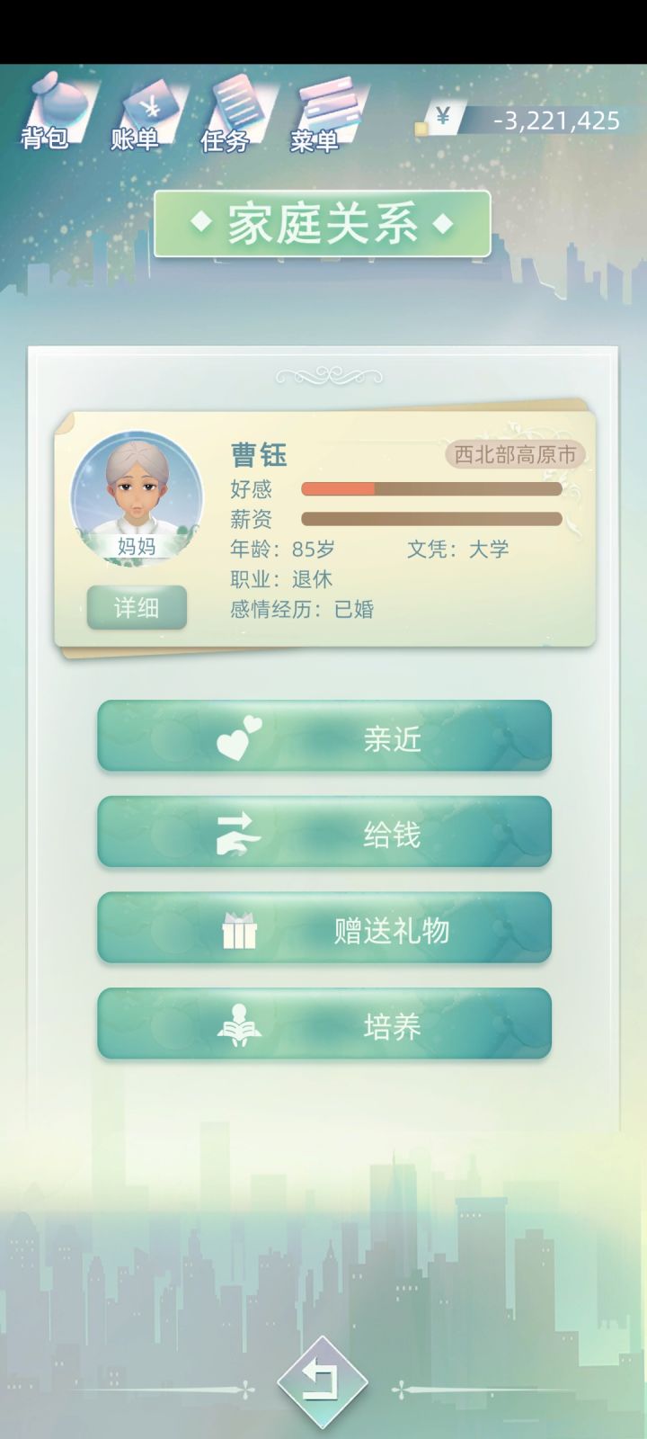 好不容易和上一世的遗孀——“我妈”关系达到100,结果她给我介绍一个挖掘车女司机,我拒绝了,从此以后关系越来越差。