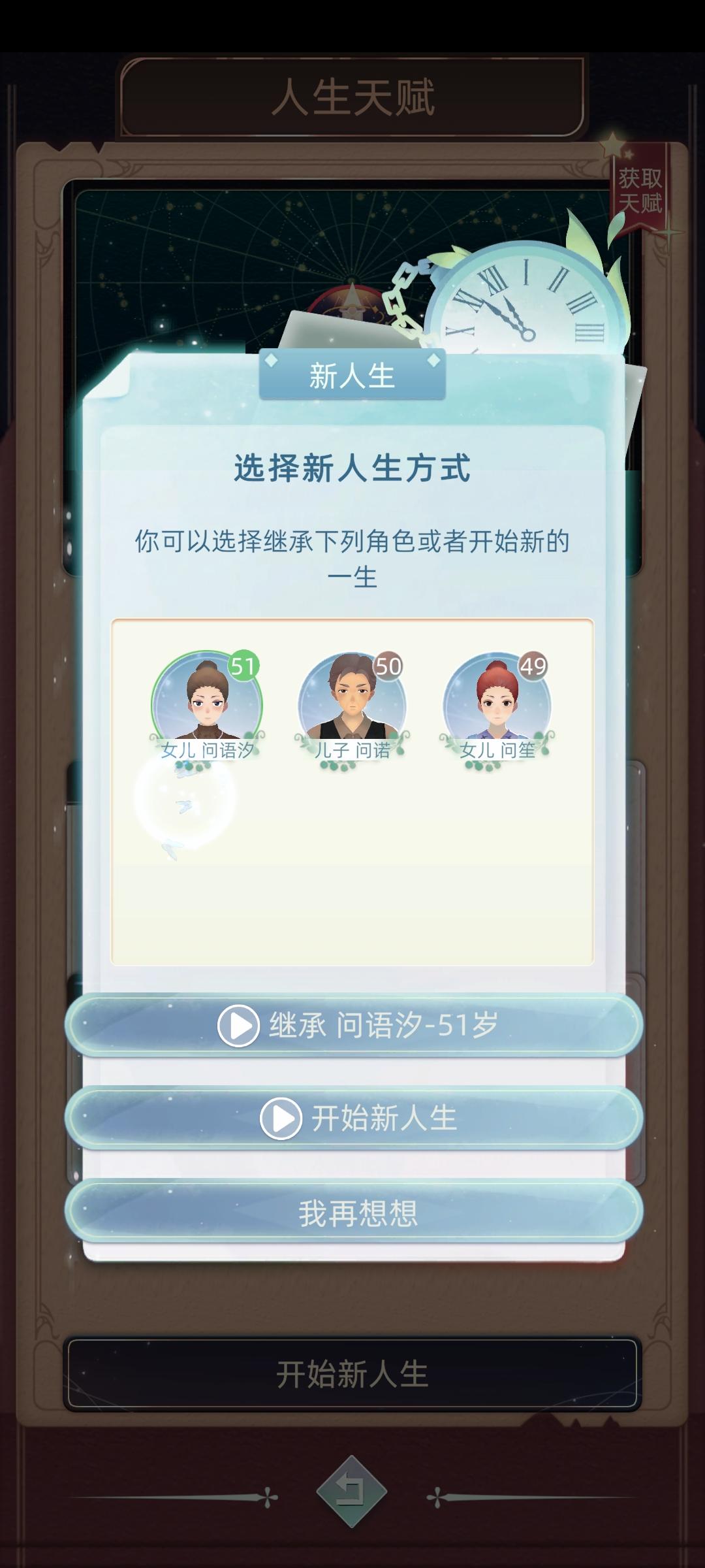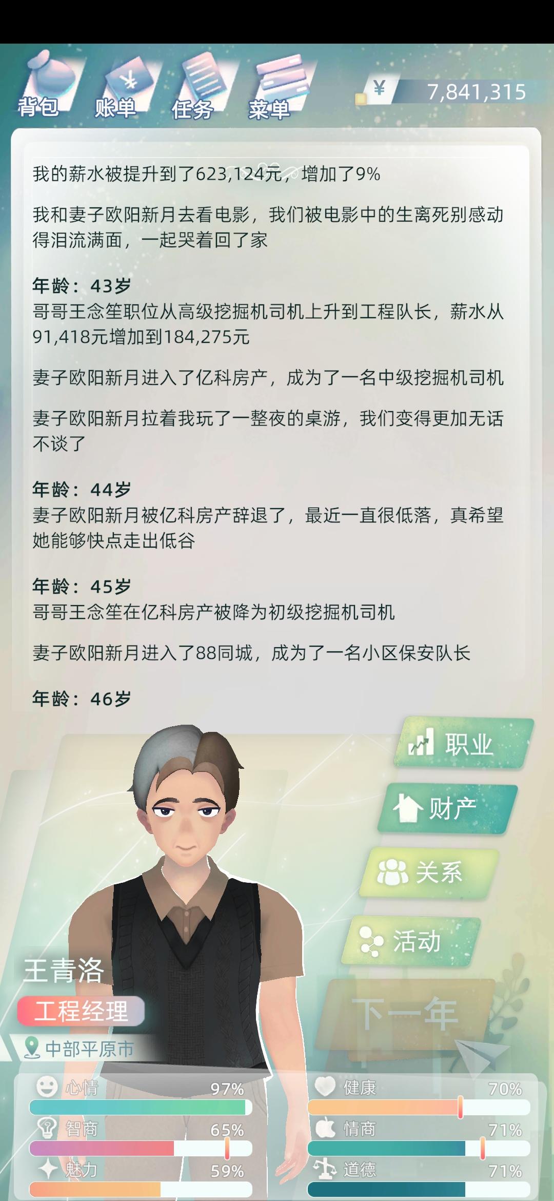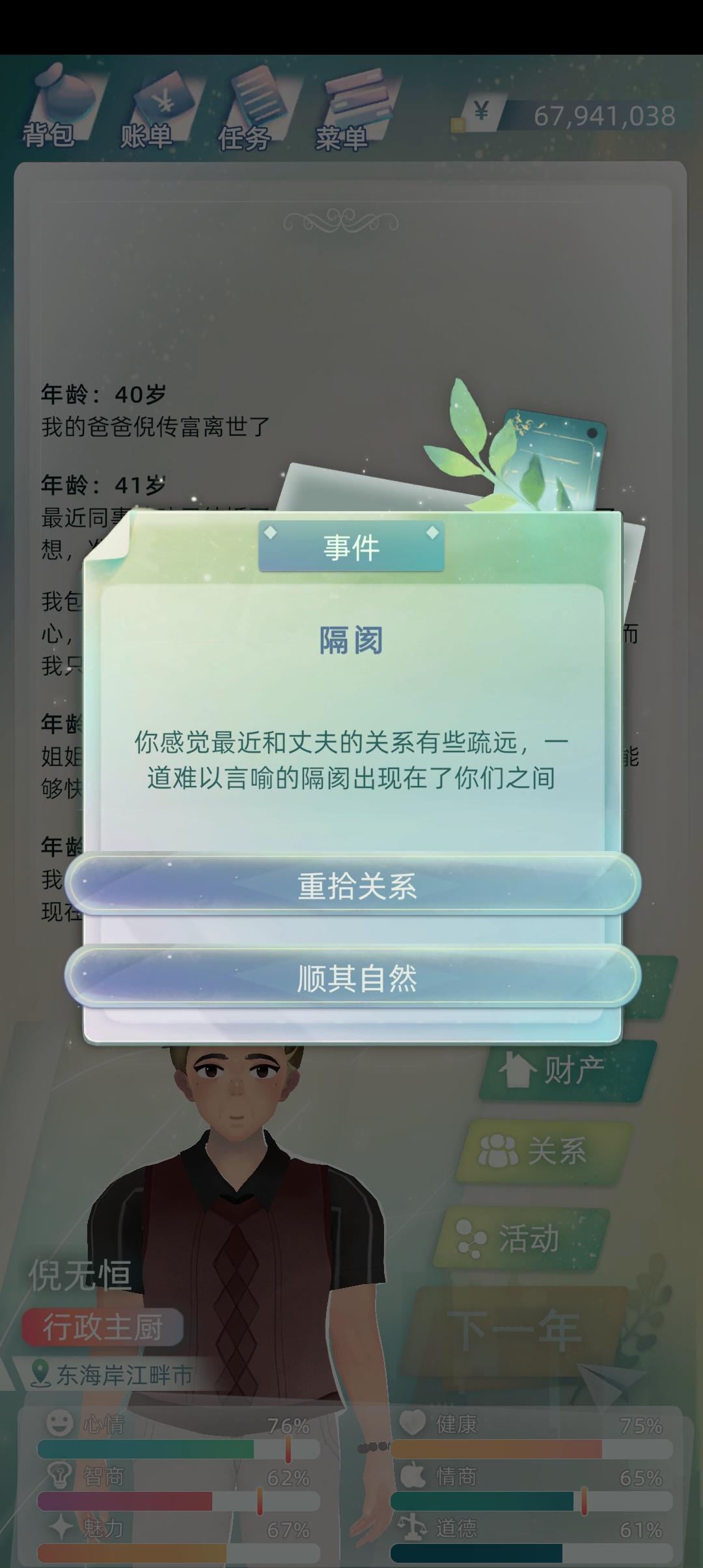 一直卡在下一年这里动不了,原本四十岁那年有了孩子,然后就一直卡在这里动不了了,游戏关了再开好几次也还是这样