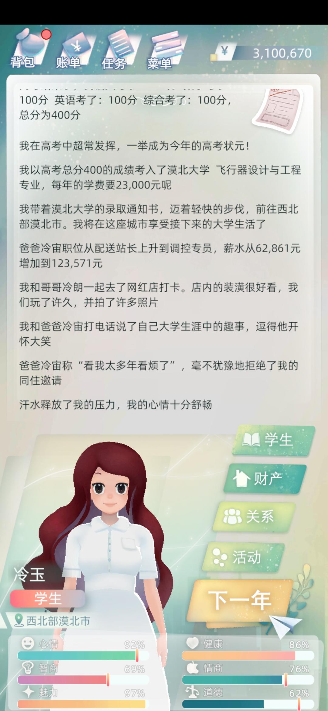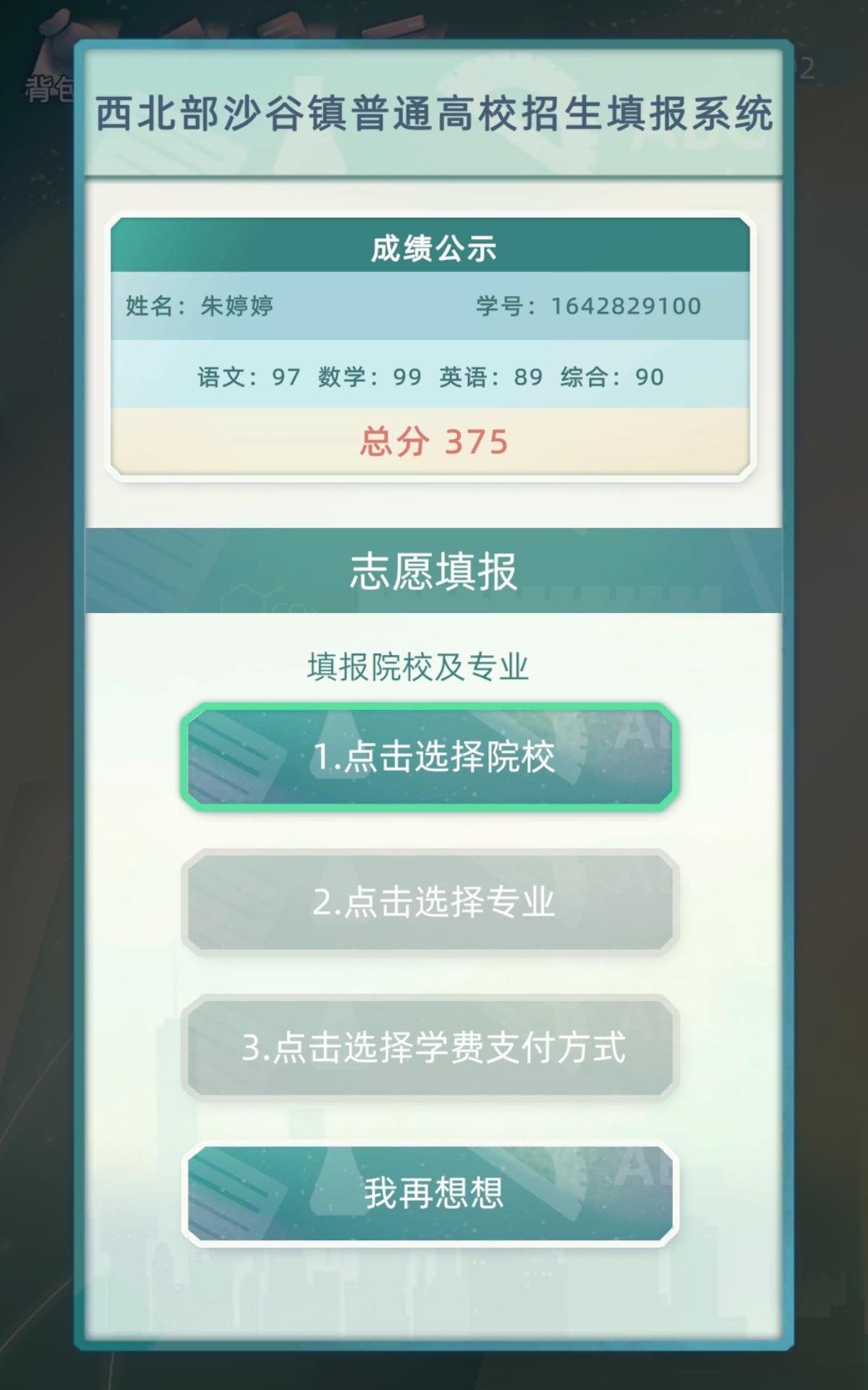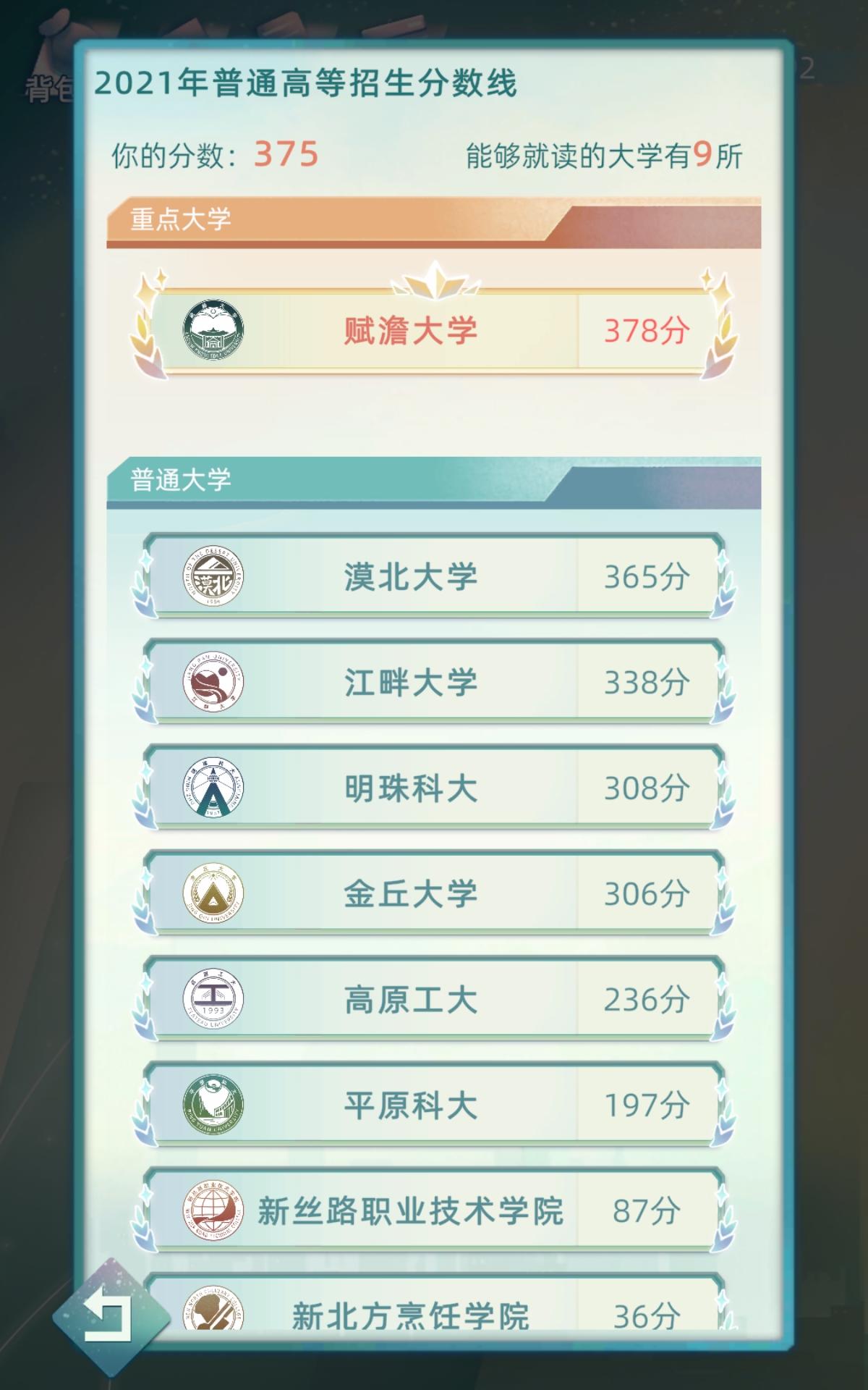 有点离谱,任务让我考巴利大学,可压根就没有这个大学,我还以为是我没更新的原因,于是去更新了,但还是木有啊╯▂╰,其次是我是高考状元,考了387分,我为了确保是考哪个大学,就先没选大学,结果在点进去总分就变成了375分了,哎,哪位大神有办法啊?救救我