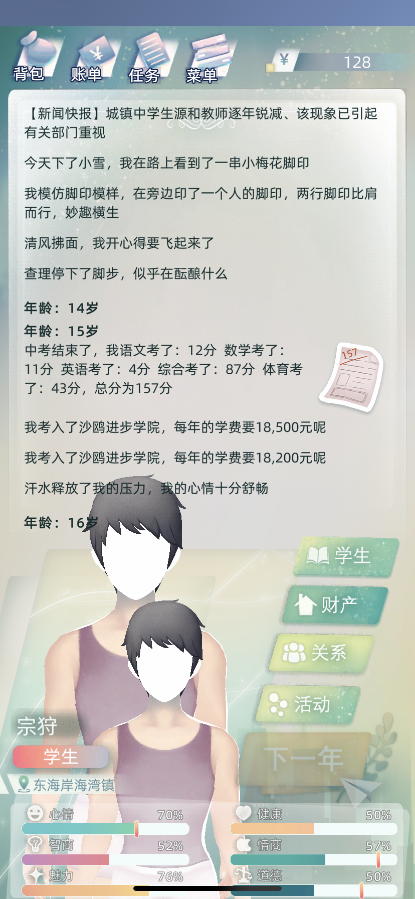 成功更新了继承的说,但是有个问题就是继承的孙子已经快奔四了,相亲角是灰的,对异性也没有表白功能,快断后了呀😂这个应该是个没有考虑到的bug吧