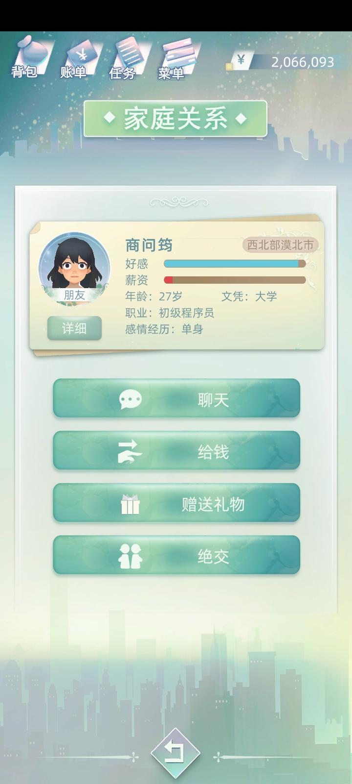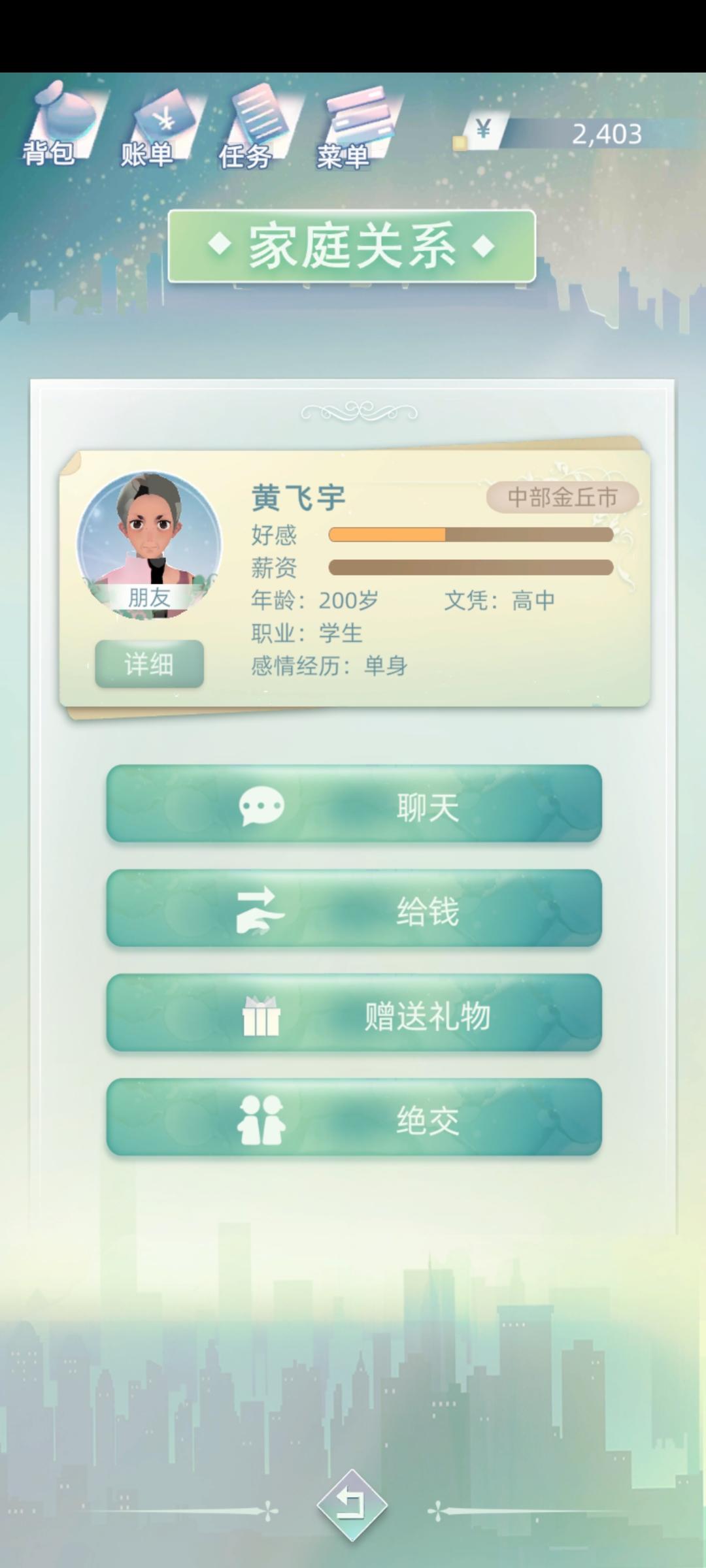反映一个大bug,我继承玩了自己的孙子,然后在关系里面她的奶奶还没有去世,我想点亲近和她增进感情,然而点了没反应,而且,更重要的是,只要和奶奶点了亲近之后,整个关系界面就点不动了,不管是爸爸妈妈都直接点不动了,只好重开,重开之后又试了几次,还是一样的结果。。。