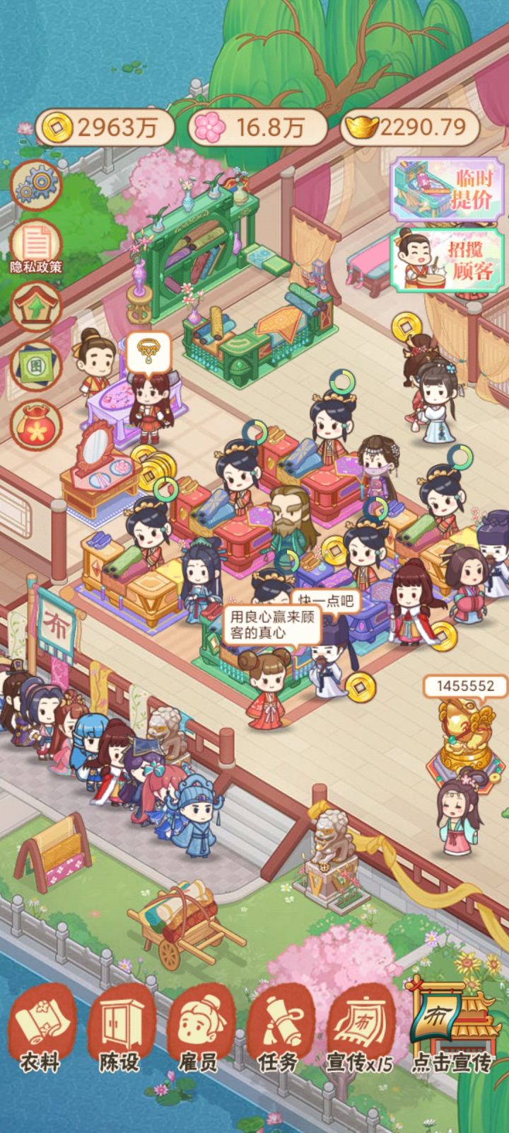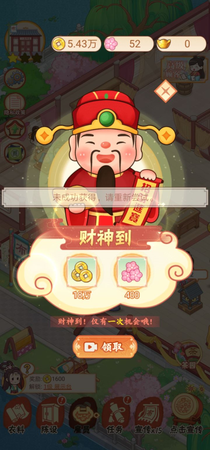 看了广告之后赚的钱都没有物品更新的钱多。任务的钱动辄几十万,但是正常经营的钱几千几千的涨。只能干等着几个小时的聚宝盆双倍来买东西,很容易就没兴趣了。一夜暴富的钱可以涨多一点。我很乐意通过看广告来攒钱。还有几十万的任务,奖励别说一半了,就几万。超级不乐意😡