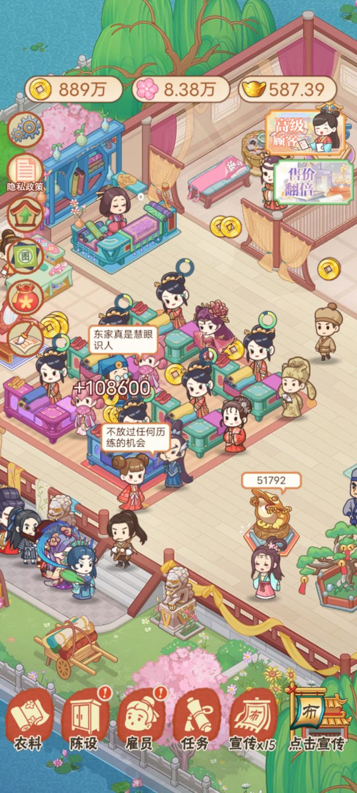 1,金钱需要的太多了,需要的钱和挣的钱不成比,为此全程都是在看广告,赶进度,感觉很累的样子2.那个宣传鼓一直点确实很累啊,不能长按吗?3,信鸽手信那里没明白玩法,我以为派出信鸽是增加声誉,带回信物,希望每个地方能像其他游戏一样,有个问号详细解释玩法4.感觉员工雇来没有用,不管是垃圾还是赶小偷,还是收集钱都是我自己来的,我为何还要雇他们,还要花钱培养5.升级设施的钱需要的太多了…挣的又太难希望官方看看吧,合理的改进改进