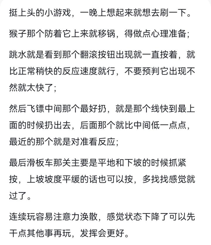 分享一个第二幕小技巧,就是在翻滚刚出现时按住,然后心里跟着它的鼓励字幕默念很好×3,太棒了×3太疯狂了在念第三遍的同时(注意是第三遍字幕要出来时松手,等看见字幕松手就晚了)松手,就会得到一个75到120之间的分数