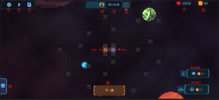 一、战斗界面&词条解释按照从文字到数字的顺序一一对应解释:-起点:敌人出生点,每当点击下一波之后就会有敌人从起点出现,并向终点移动-终点:需要阻止敌人到达此处,当敌人未被消灭到达此处时,会扣除生命盾-商店等级:点击可消耗代币进行等级提升,等级提升后有概率可以购买更高等级的模块,同时配方商店也可以刷出更高等级重构塔的配方-购买模块:点击可消耗代币购买模块获得元素塔,一次购买会随机出现三块模