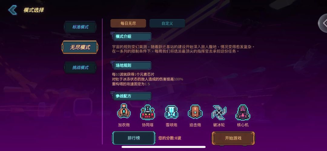 首先明确一点无尽挑战每天会更新不同的规则以及允许用的 重构防御塔这边每个等级的防御塔功能作用都不一样所以想要通关更高的关卡一定要先明确一点那就是你准备用哪种防御塔作为核心,核心的选择并不是特别多能作为核心的防御塔一般都会有一个特长要么攻击速度块要么攻击力超级高要么可以构成羁绊效果使得防御塔属性超高俗称养猪,这边推荐几个可以作为核心使用的防御塔第一个一级急射防御塔,这个防御塔攻速奇高并且带有公里成长