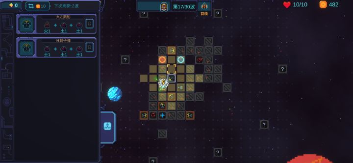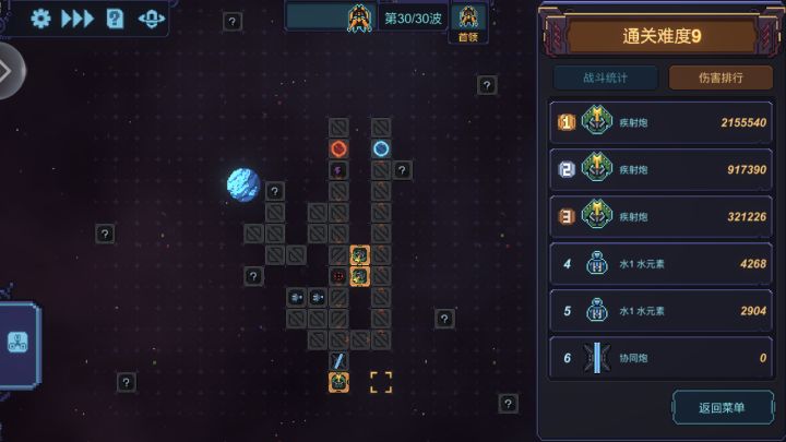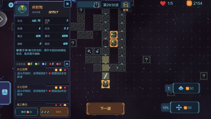 之前发的攻略下面有兄弟说难度7就不能只靠疾射塔了,确实试了一把难度7小怪的血量提升了不少,打完金币怪之后就明显觉得会漏怪了。不能再像之前难度随便点下一波攒钱了,但我觉得还是可以挣扎一下。阵容老规矩【疾射炮】、【散射炮】、【雪球炮】、【狙击炮】科技还是优先选了加元素数量的,也选了多一条命的。尽量在3波之后就合成第一个疾射塔,7波前后合第二个疾射塔。我在17波的时候喝了5个疾射塔,其中一个叠了1