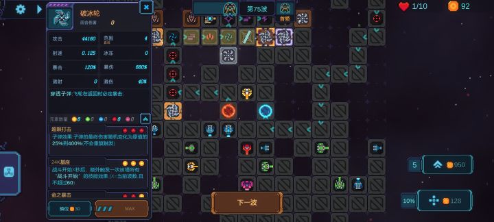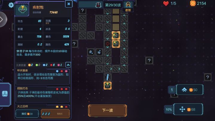 粗略的看了一点电脑版的攻略,挺详细的,不过电脑版和手机版的是有差别的也不能照搬,不过可以获得大量启发。1.核心机做为游戏输出核心我对于它的一些测试24k词条可以触发核心机被动技能,不过范围依然是1格,只是重复计算了2次加伤。所以有科技核心机+1范围的最好拿了,效果不错。(ps:昨天打的无尽模式打到一半,然后今天继续,从50几关到70关前还没问题,到了70关就开始出bug。所以炮台只转圈不攻