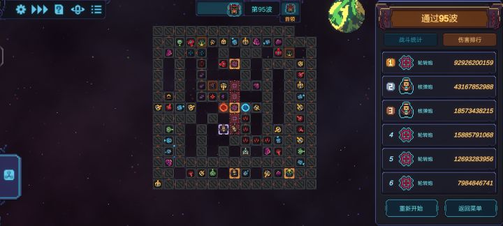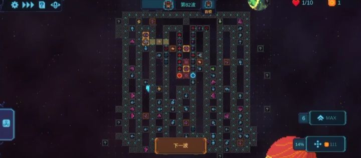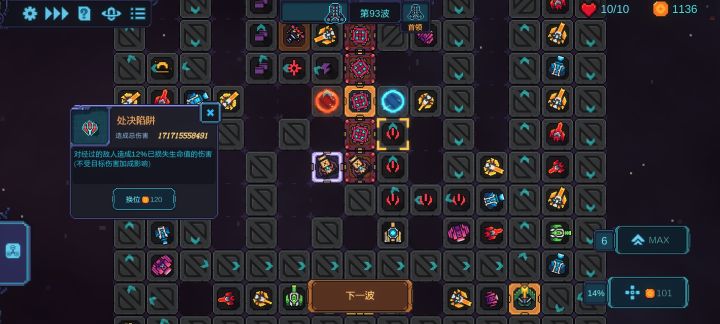 打的自定义,BUFF点满了。一开始选转轮炮是因为后面的冰冻小飞机和神奇太多了,分裂子弹打不过了,想到转轮炮是集体伤害于是就选了试一试。就上冰冻和易伤来说,加了远征和引力弹弓的转轮炮效果还行,但是这个塔的数值真的是太低了,一样的重构核弹炮攻击能上万,转轮炮就只有几千,后面真的是一点打不动(这还是点了那个升级,群怪一点打不动)。这个过程比较让人惊喜的一个发现是,增幅器配处决陷阱伤害