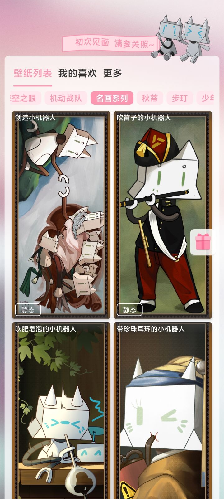 我很喜欢这种类型的,可为什么都是猫猫头类型的机器人呀?希望有点其他类型的世界名画,加油(ง •̀_•́)ง