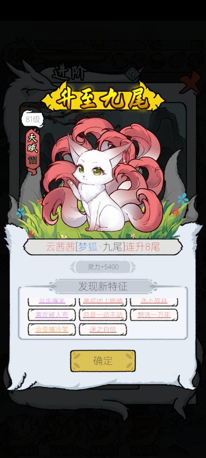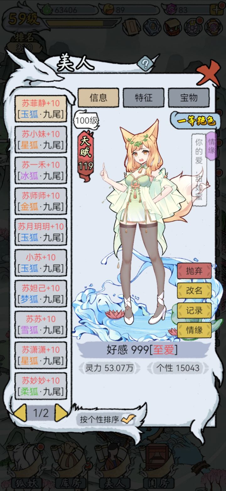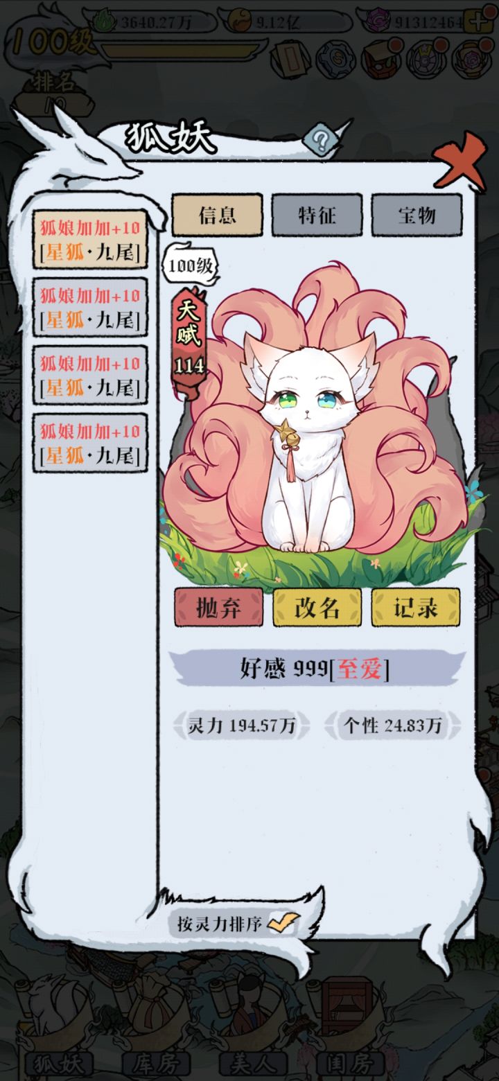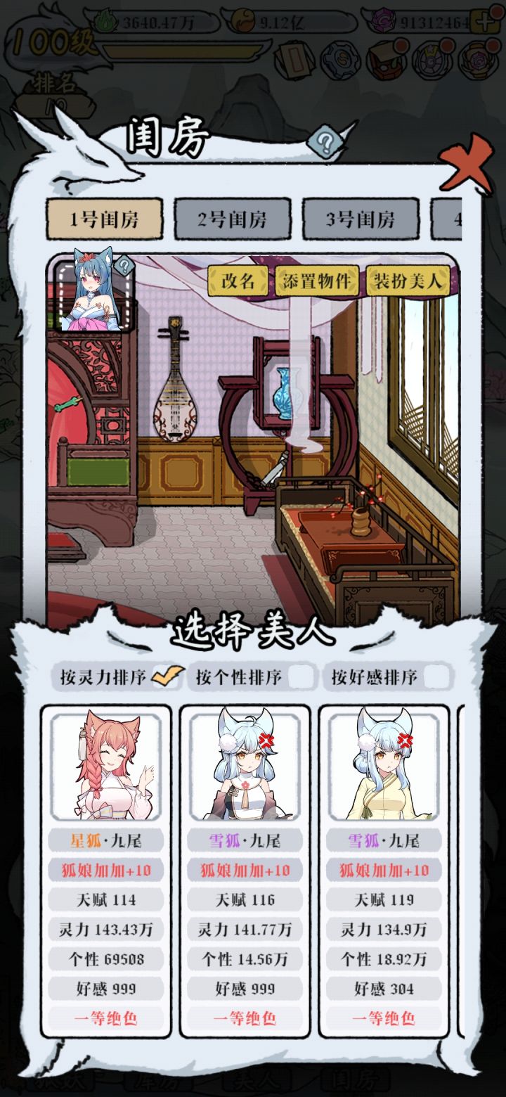 建议大家一次收留2-4个狐妖让它们自动挂机,没必要一次化形很多个,后宅一个月才一百万,自动挂机加上各种强化只需要3-5天就能达到两百万,一旦化形你就只能丢后宅和美食才能加属性了,而且加的特别少,实际上手动操作,狂点一小时就能上百万